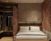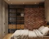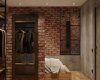 В спальне выполнено визуальное зонирование на пространство с кроватью и гардеробом. Для создания легкости и открытости пространства кирпичную перегородку между пространствами спальни сделали ниже высоты основных стен квартиры. Зона изголовья оформлена мебельным коробом и подвесным шкафом, создающими нишу с подсветкой. Чтобы запустить дневной свет в помещение спальни решено было установить окно в темной раме, стекло будет пропускать дневной свет в комнату, но со стороны гостиной спальня не будет просматриваться за счет использования зеркального стекла. Гардеробная открытого типа выполнена на черном металлическом каркасе с деревянными полками и ящиками для хранения.