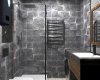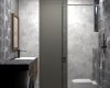 Состаренный эффект серой плитки в сочетании мозаикой создают темное и одновременно лаконичное пространство душевой комнаты. Концепция сочетания темного и светлого поддерживается контрастной сантехникой. Интересное решение конструкции столешницы для встраивания раковины и стиральной машины. Зеркало в деревянной раме и металлическая решетка поддерживают стиль и добавляют грубоватости дизайну.