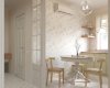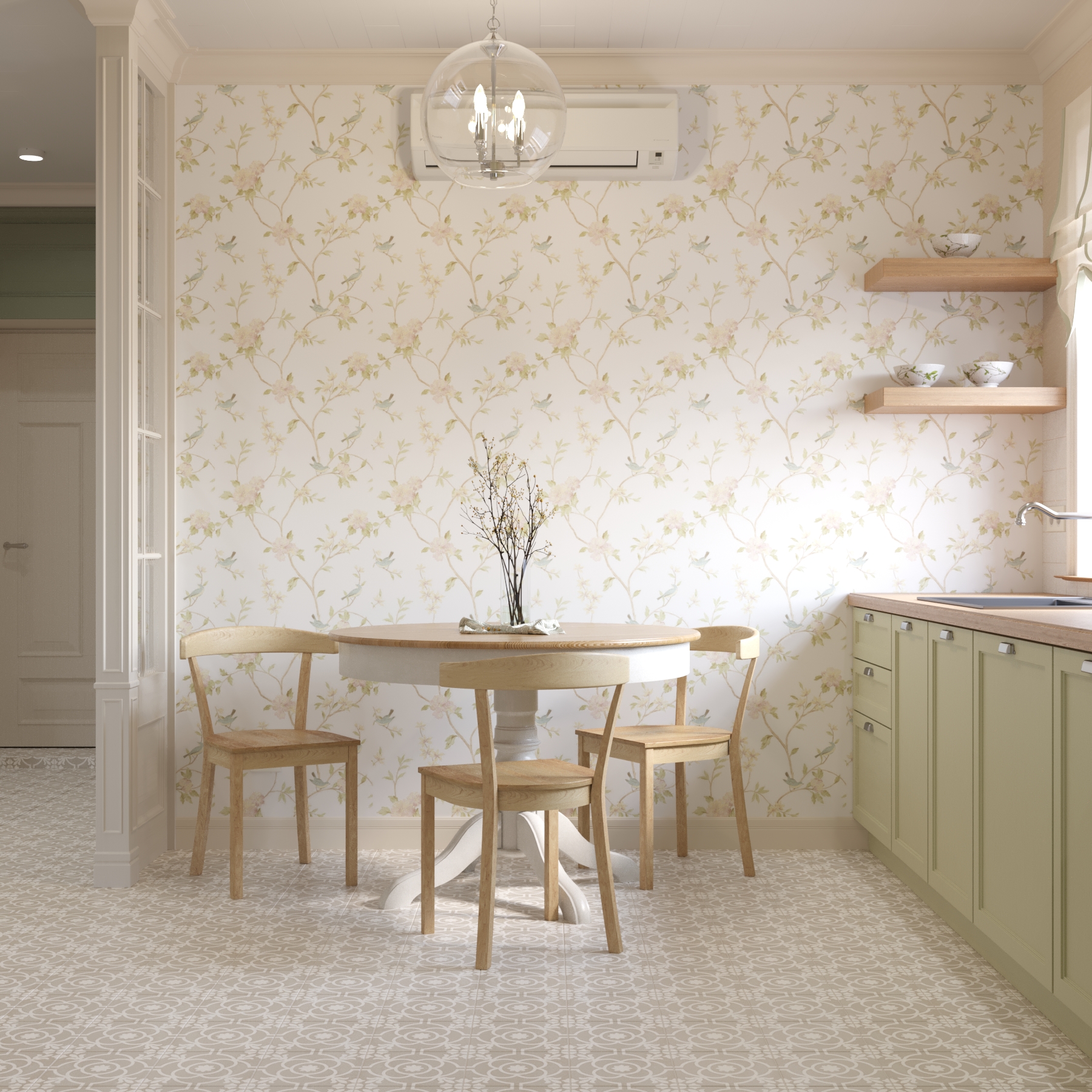 Главное помещение, где за обеденным столом будет собираться вся семья – это кухня. От зоны прихожей ее отделяет мебельная перегородка со стеклом и фацетами. Кухонная мебель организована около окна, оформленного во французском стиле. Идея оформления интерьера дома вдохновлена весной, элементами стиля Прованс. Обои с растительным орнаментом, мягкий оливковый цвет кухни и текстура дерева создают теплую атмосферу. Орнаменты в ажурной плитке на полу перекликаются с веточками в обоях, зеленые невысокие панели и проем у входа в дом добавляют цвета и контрастности пространству.