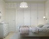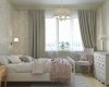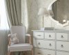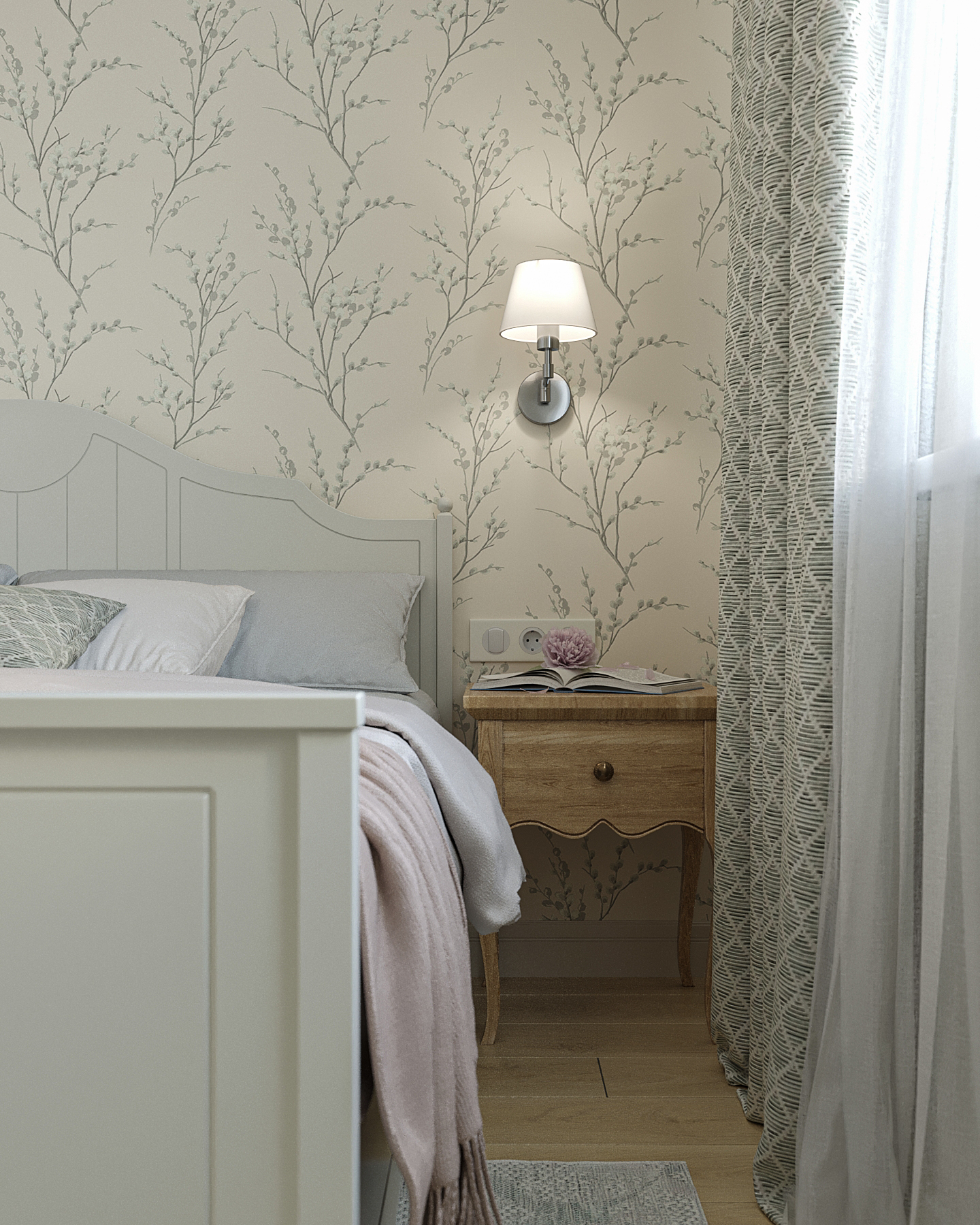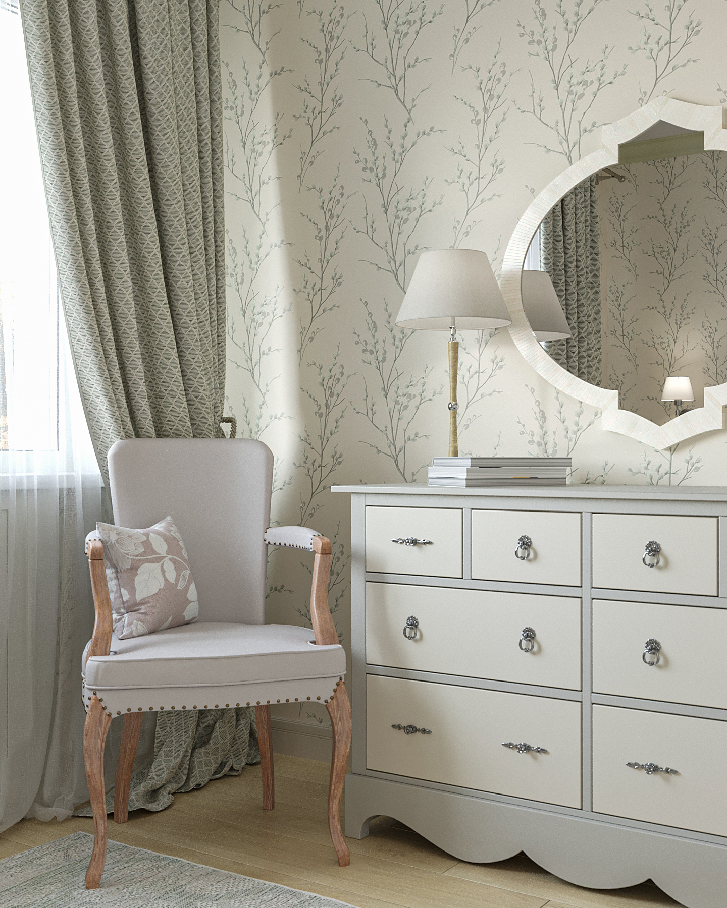 Обои с орнаментом вербочек создают чистую, добрую, уютную атмосферу спальни. Текстура дерева на полу и в прикроватных тумбах лаконично добавляет теплоты, а нежный оливковый цвет потолочных карнизов – свежести. Особое украшение напротив изголовья кровати – это зеркало интересной формы, рама которого инкрустирована белой костью. Под ним расположился комод в стиле Прованс с ажурными ручками.