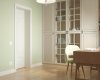 В доме предусмотрена комната широкого назначения. Она соединяет в себе библиотеку, рабочий кабинет, а также гостевую комнату с предусмотренным спальным местом на диване. Одна стена оформлена полностью встроенным шкафом, которому легкость придают дверки со стеклом и фацетами и открытые полки. Для освещения рабочего стола в темное время суток предусмотрено бра на подвижном основании. Окно обрамлено светлой римской шторой с графичными зелеными кантами и полочками для книг. В отделке комнаты использованы обои с лаконичным цветочным принтом и акцентная покраска, которая добавляет свежести.