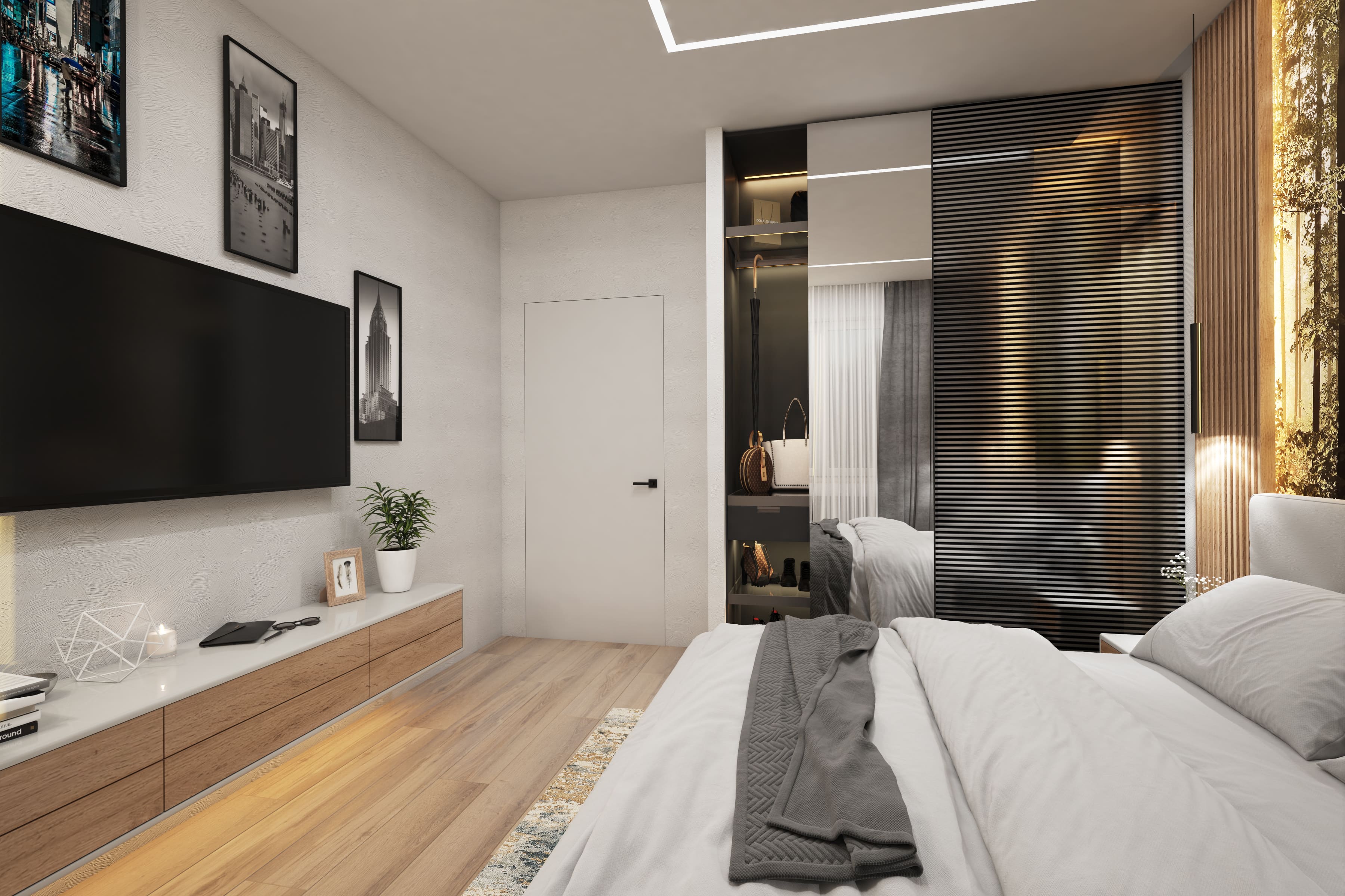 Кухня-гостиная, в этой квартире, объединена с лоджией, что, значительно расширило пространство помещения. Квартира в стиле «домашний лофт» или «лёгкий лофт». Не вполне урбанистично, но, с элементами. Основными чертами лёгкого лофта являются ярко-белые стены, которые прекрасно отражают свет и создают эффект пространства. Использование натуральных материалов, таких как дерево, кирпич и металл, придаёт интерьеру ощущение дерзкости и непосредственности. В сенузле использовался керамогранит под бетон двух тонов и керамогранит под дерево в зоне ванны.