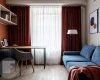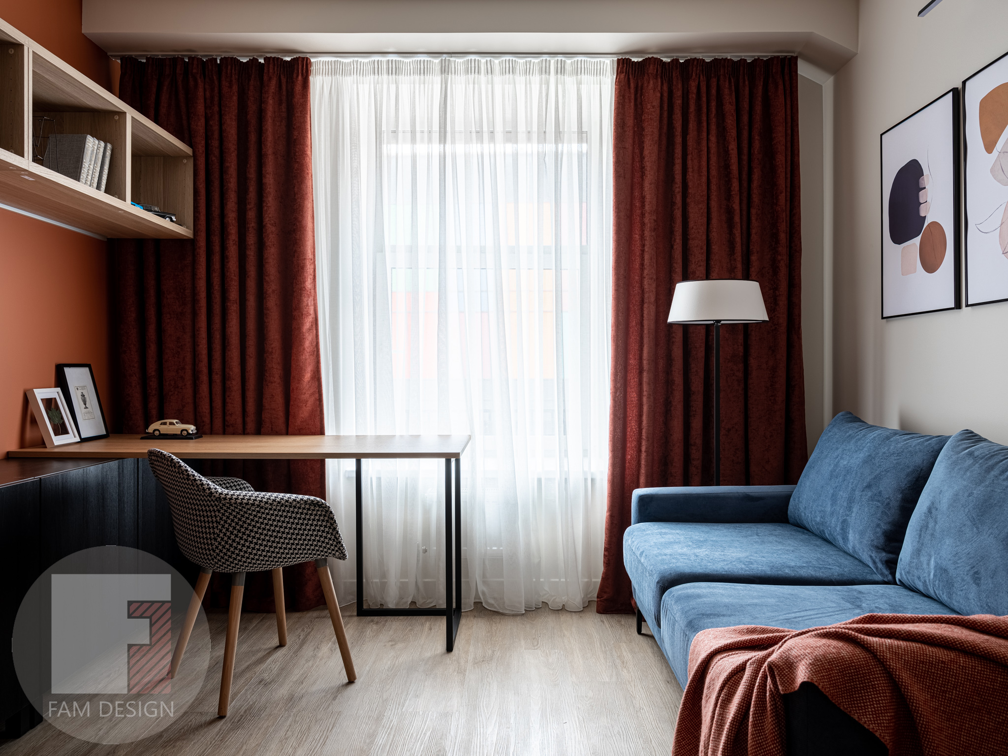 Эти небольшие апартаменты наши заказчики используют во время своих частых визитов в Москву. В задачах стояло создание удобного пространства для работы и отдыха, предусмотреть места хранения и возможность работать или отдыхать не мешая друг-другу, сделать интерьер ярким и современным и уйти от банальных и ставших слишком популярными решений вроде уже поднадоевшего лофта. Маленькое помещение с большим количеством задач? Мы обожаем такие вызовы! Чтобы создать удобную планировку, пришлось поломать голову и рассмотреть множество вариантов. В итоге удалось схитрить и появился диагональный коридорчик, который не только преобразил геометрию помещения, но и позволил разместить все требуемое: 2 просторные гардеробные, удобную ванную комнату с большой душевой кабиной, стиральной машиной и возможностью не чувствовать себя как на складе сантехники). Удалось выгородить отдельную спальню и в ней рабочую зону у окна, светлую, с глубоким подоконником и красивым фоном для съемки. Проект реализован полностью - от идеи до переезда хозяев.