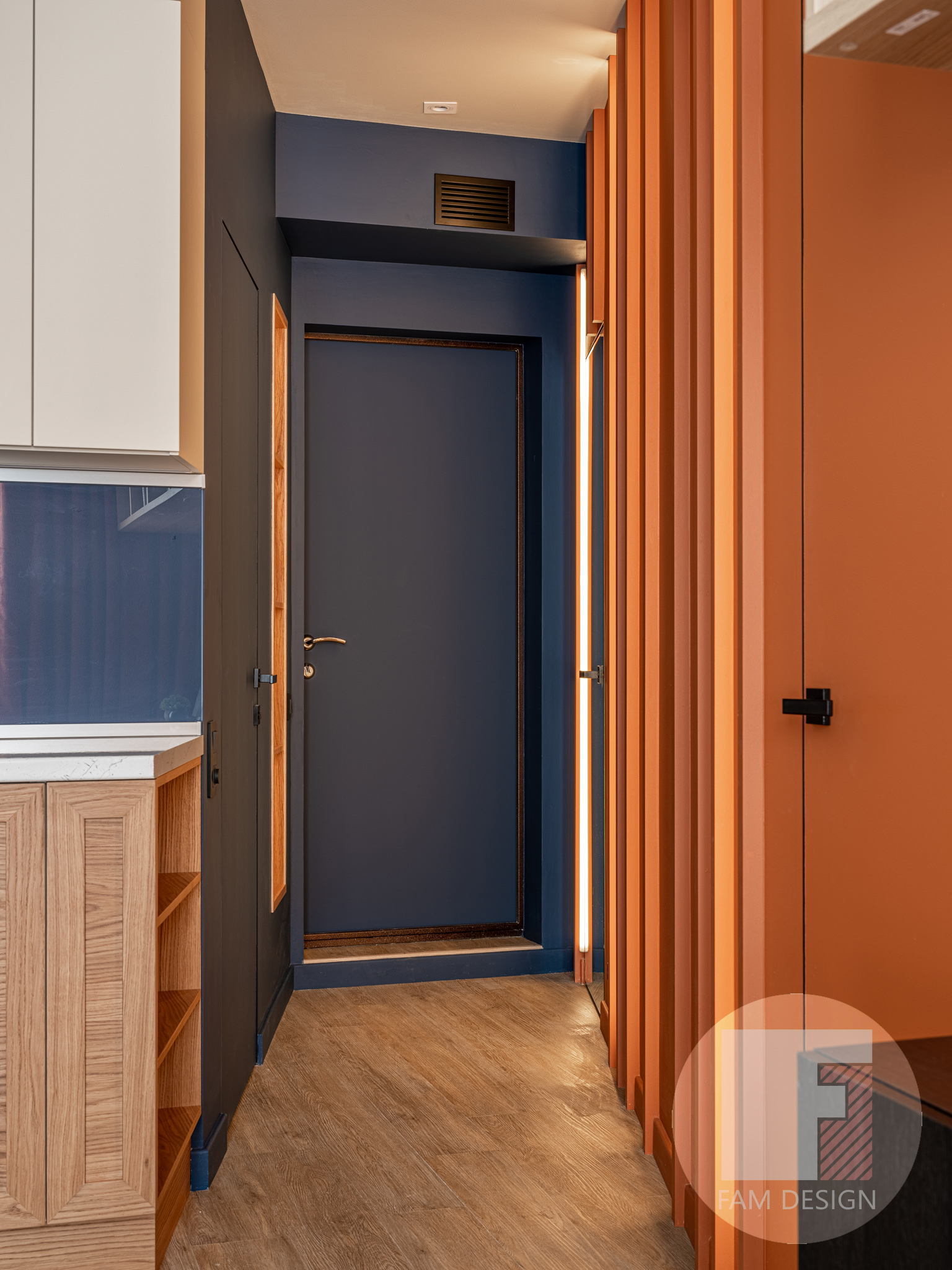 Эти небольшие апартаменты наши заказчики используют во время своих частых визитов в Москву. В задачах стояло создание удобного пространства для работы и отдыха, предусмотреть места хранения и возможность работать или отдыхать не мешая друг-другу, сделать интерьер ярким и современным и уйти от банальных и ставших слишком популярными решений вроде уже поднадоевшего лофта. Маленькое помещение с большим количеством задач? Мы обожаем такие вызовы! Чтобы создать удобную планировку, пришлось поломать голову и рассмотреть множество вариантов. В итоге удалось схитрить и появился диагональный коридорчик, который не только преобразил геометрию помещения, но и позволил разместить все требуемое: 2 просторные гардеробные, удобную ванную комнату с большой душевой кабиной, стиральной машиной и возможностью не чувствовать себя как на складе сантехники). Удалось выгородить отдельную спальню и в ней рабочую зону у окна, светлую, с глубоким подоконником и красивым фоном для съемки. Проект реализован полностью - от идеи до переезда хозяев.