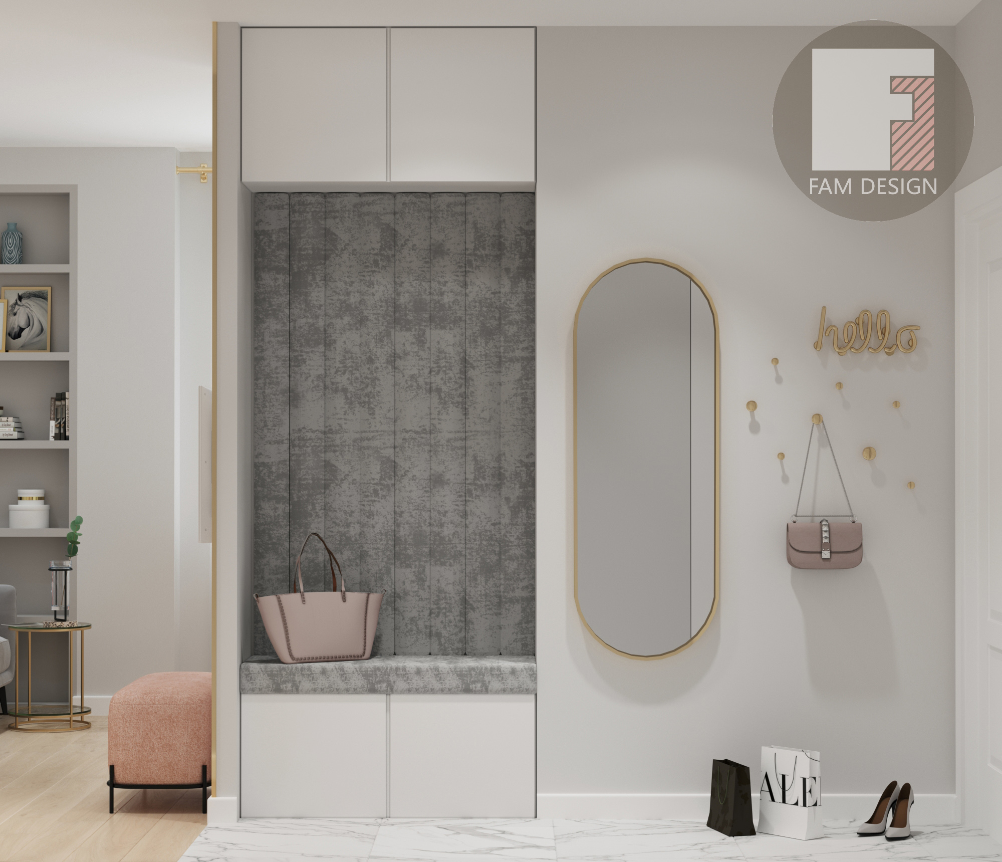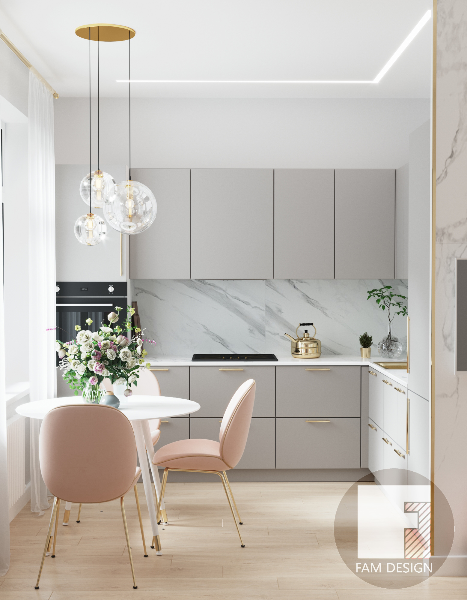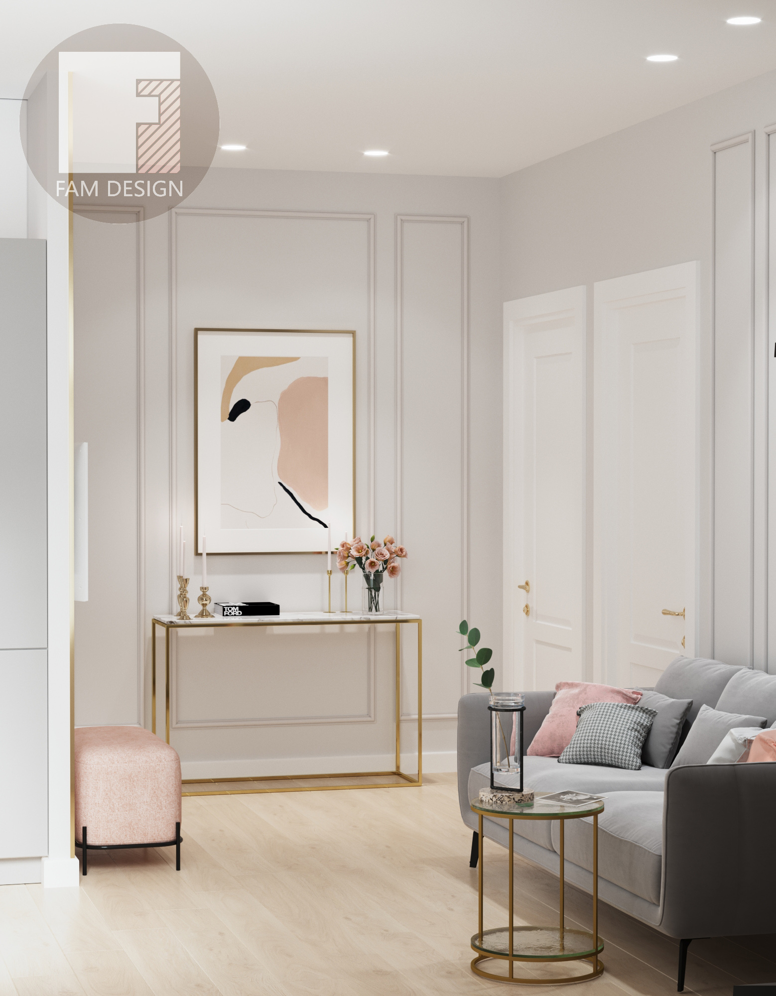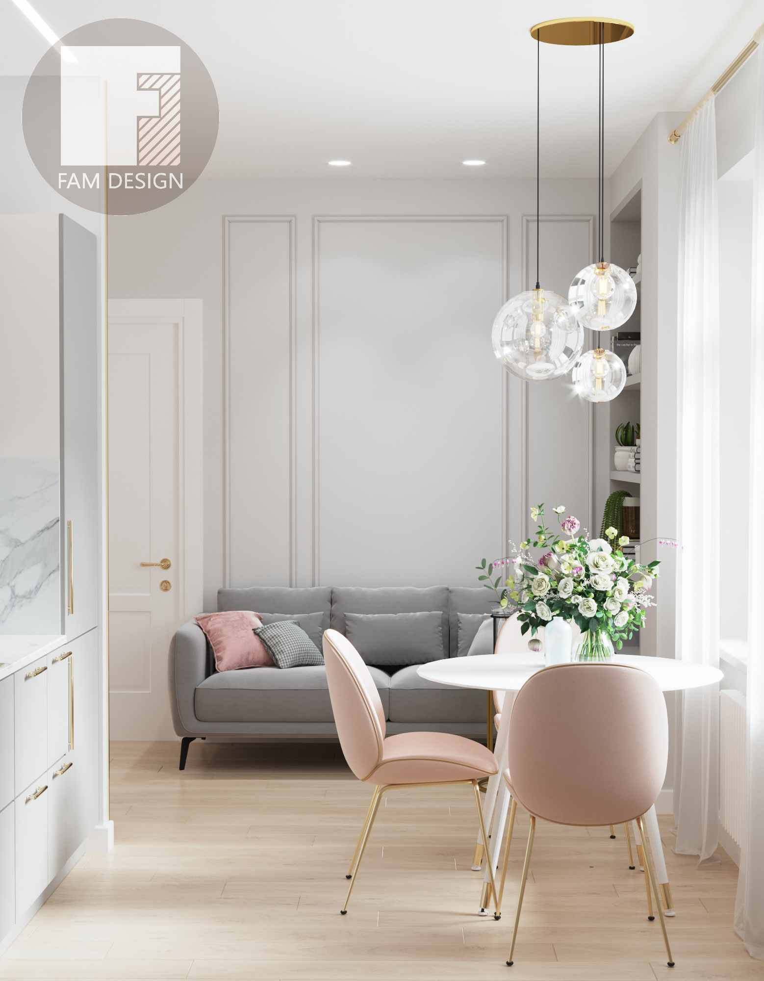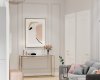 В этом проекте стояла задача в условиях ограниченного бюджета создать элегантный интерьер, смешав классические приемы отделки и современную мебель, добавив немного лоска в виде элементов из матового золота и отделки мрамором. Никаких дорогостоящих предметов и минимум мебели на заказ, и это как раз такой случай, когда результат выглядит намного просторнее и роскошнее, чем можно было ожидать при таком бюджете. Все подобрано настолько аккуратно, что никто и не догадается о реальной стоимости интерьера! Отличный пример ценности работы дизайнера!