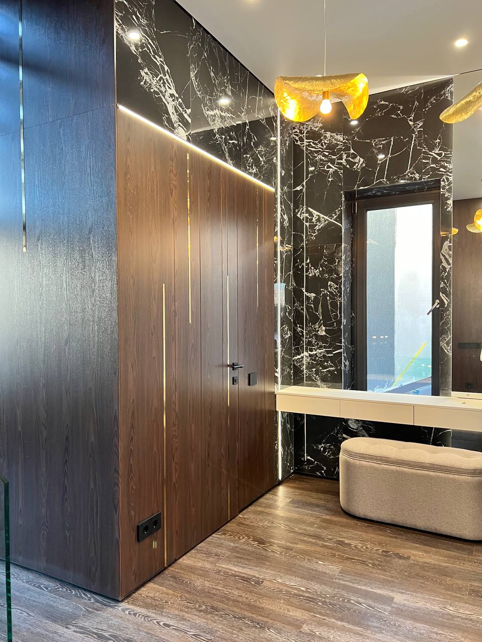 уборки покрытиям. Самое грязное место в доме — вход и зона лестничного пролета, ведь они постоянно используются и их сложнее всего мыть, поэтому мы отдали предпочтения керамограниту и специальным панелям и консолям с пластиковым покрытием, которые легко моются и трудно повреждаются. Отдельными изюминками входной группы стали минималистичная парящая лестница с подсветкой через каждые две ступени и светильники из фольгированного золота, изготовленные под заказ.