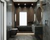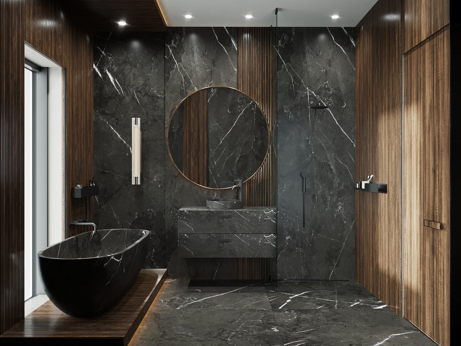 Просторная ванная комната в стиле минимализм, в которой нам удалось разместить отдельную душевую и ванну. Мебель и сантехника дублируют отделку помещения, освещение на разных уровнях создаёт романтическую атмосферу. Деревянные панели покрыты специальным SPS-покрытием, в составе которого отсутствуют гигроскопичные компоненты, поэтому они обладают стопроцентной влагостойкостью и не потеряют свой внешний вид долгие годы. Из санузла есть выход на террасу: летом можно выйти позагорать, а сразу после принять душ, а зимой понежиться в тёплой ванне.