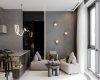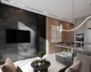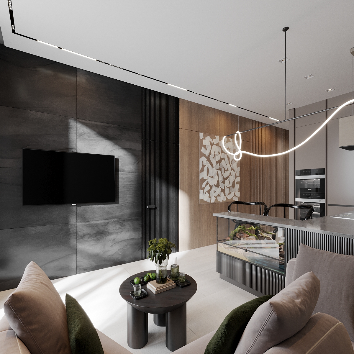 За диваном на стене мы разместили авторские светильники, похожие на жучков — получилась отсылка к природе теплых стран. Зона отдыха оснащена телевизором, на массивном небольшом столике находится зелень. Отделка стен зонирует пространство: зона отдыха выполнены в серой мраморной отделке, а кухня визуально отделена древесными мотивами, её украшает авторское панно. В стену встроены две скрытых двери в спальню и в санузел.