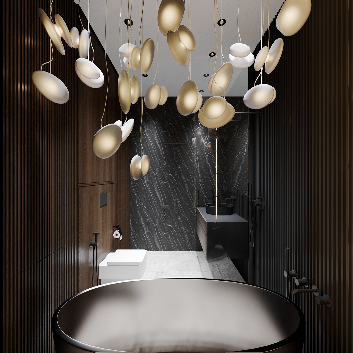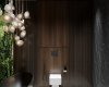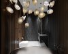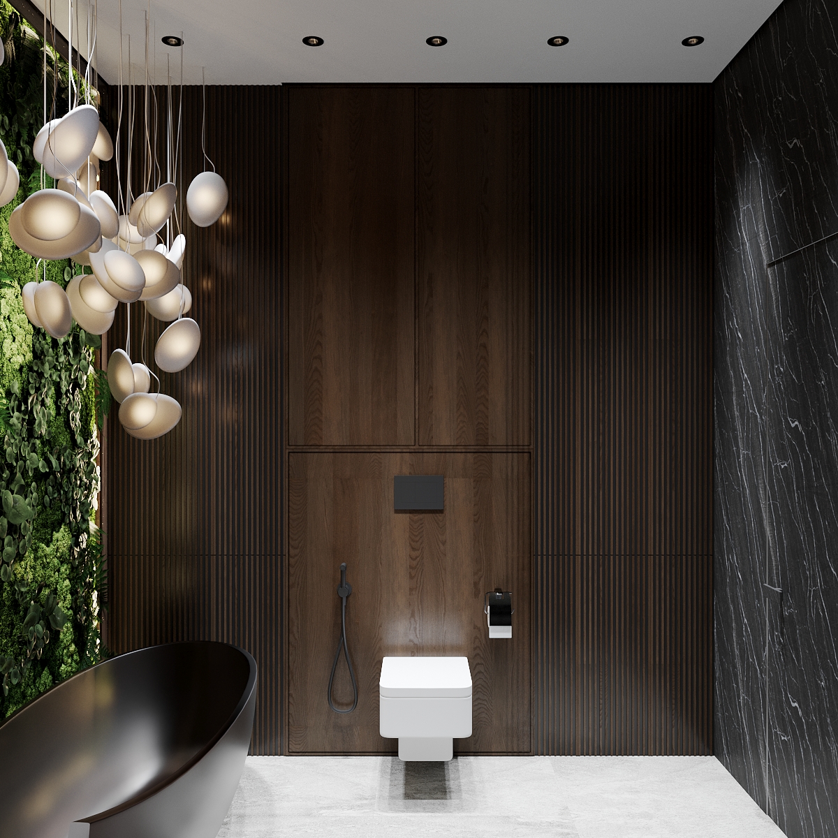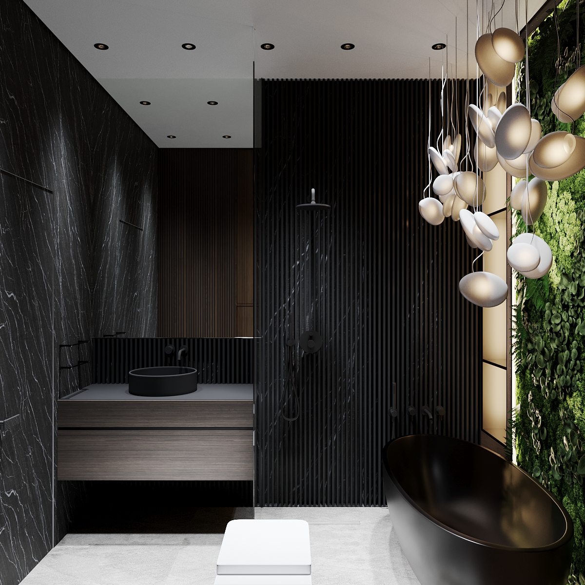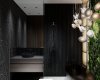 Переходим к изюминке этой квартиры — роскошному санузлу. Огромная зеленая зона в ванной комнате привносит нотку тропического рая в интерьер, делая его поистине уникальным. Для поддержания мальдивского стиля мы решили установить отдельно стоящую каменную ванну и украсить помещение роскошным зеленым панно из живых стабилизированных растений. Это настоящие растения, подвергшиеся специальной обработке, при которой натуральный сок заменяется глицериновой смесью. Такие растения не нуждаются в особом уходе и живут очень долго. Сама ванна чёрная снаружи, но светлая внутри — это специальное решение для того, чтобы не закольцовывать пространство и облегчить уборку. Таким образом, принимая ванну после трудного рабочего дня, клиент оказывается рядом с роскошной зелёной стеной с подсветкой. Дополнительно мы использовали психологию цвета, поскольку зелёный цвет помогает настроиться на новый лад, освежает внутреннее состояние и позволяет почувствовать единение с природой. Группа светильников отсылается к ракушкам и пляжу. Огромное зеркало, изготовленное специально для этого проекта, зрительно расширяет пространство Слева от зеркала вы можете видеть ручную авторскую роспись стены — ещё один элемент творческого начала. Помимо ванной мы разместили душевую — мы уверены в том, что каждое пространство должно быть бескомпромиссным и функциональным, поэтому стараемся не выбирать между двумя вариантами, а органично встраивать и душ, и ванну. В качестве цветов сантехники мы отдали предпочтение чёрным матовым поверхностям, исключая инсталляцию — поскольку она находится над светлым керамогранитным полом, мы решили не утяжелять пространство.