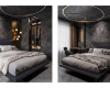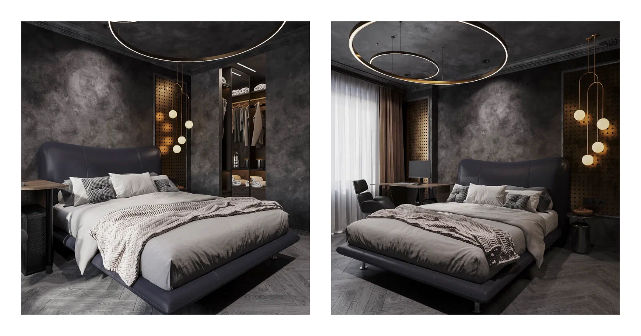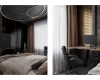 А вот и шикарная просторная спальня. Помещение выполнено в тёмных тонах с золотыми акцентами. Для того, чтобы предотвратить приступы обострения аллергии, мы изготовили кровать из натуральной кожи. Под кровать сможет проезжать робот-пылесос для сбора пыли. Рядом с кроватью находится компьютерный стол с кожаным удобным креслом.
