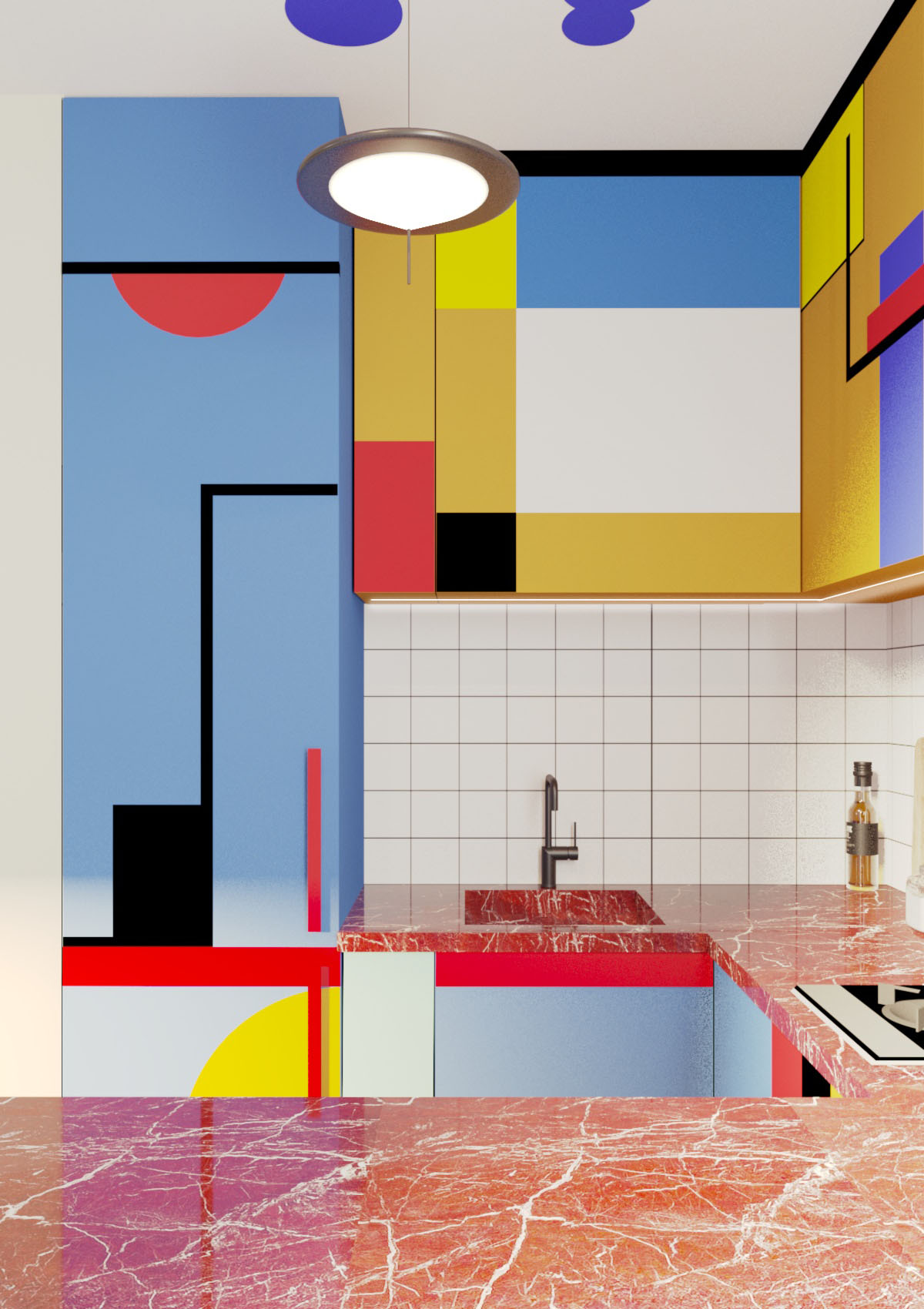 Эта квартира создана в ярких цветах с элементами авангарда, отражает влияние работ художников-авангардистов, таких как Василий Кандинский и Казимир Малевич. Основные элементы интерьера включают яркие цвета (насыщенный синий, жёлтый, красный, зелёный ) геометрические формы и линии, а также использование современных материалов и технологий. Создавая этот смелый интерьер, хотелось показать, что квартира может быть не просто обыденным жильем, но настоящим произведением искусства. Смотря на мебель, стены и все предметы находящийся в квартире, складывается ощущение, что там побывал художник и расписал все вокруг. Где-то пролилась краска, в каких-то местах он рисовал не отрывая кистью от предмета к предмету, соединяя их в единую композицию. Квартира представлялась нам свободным холстом, который очень ярко заиграл в руках художника, вдохновившегося авангардистами прошлого века.