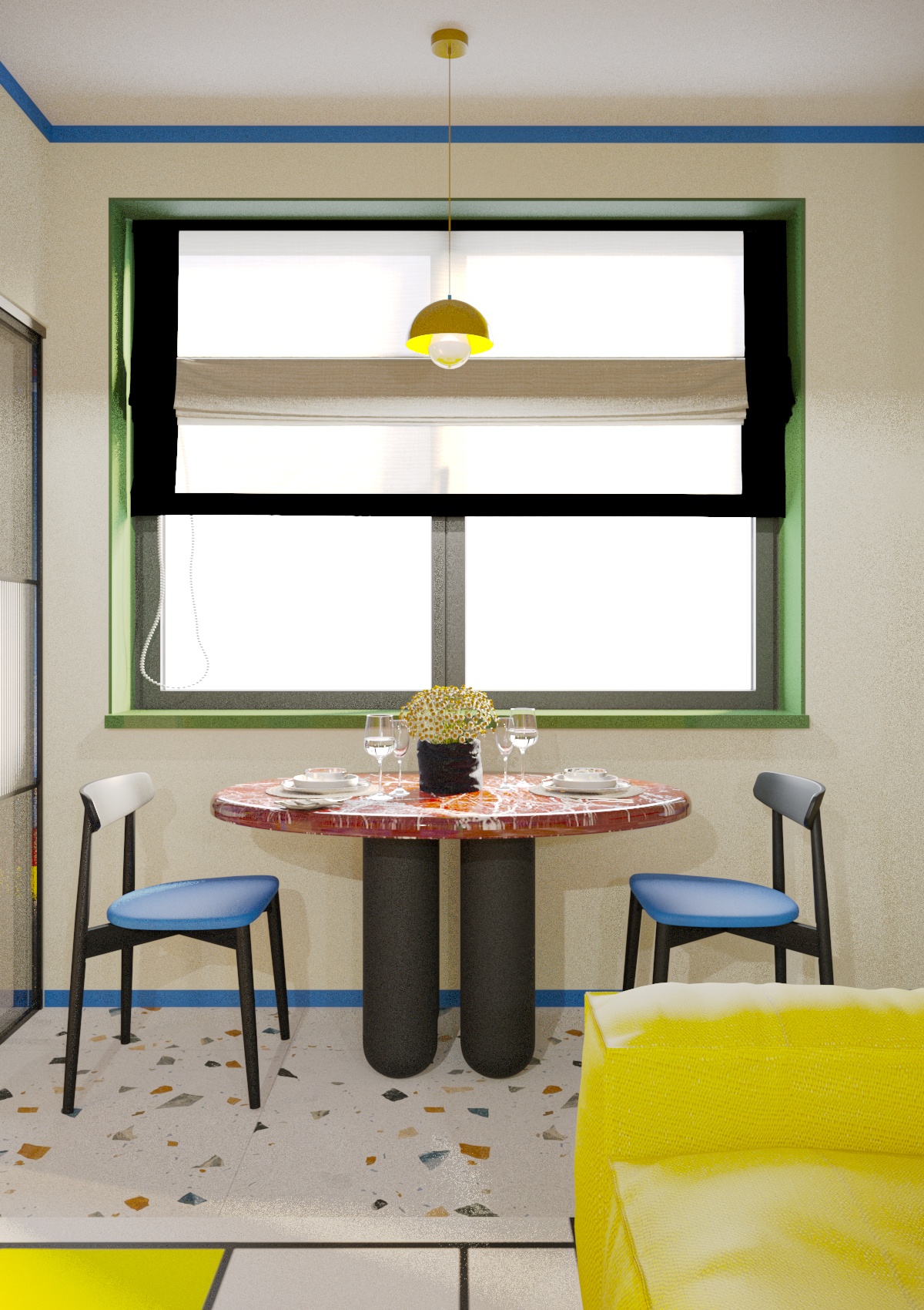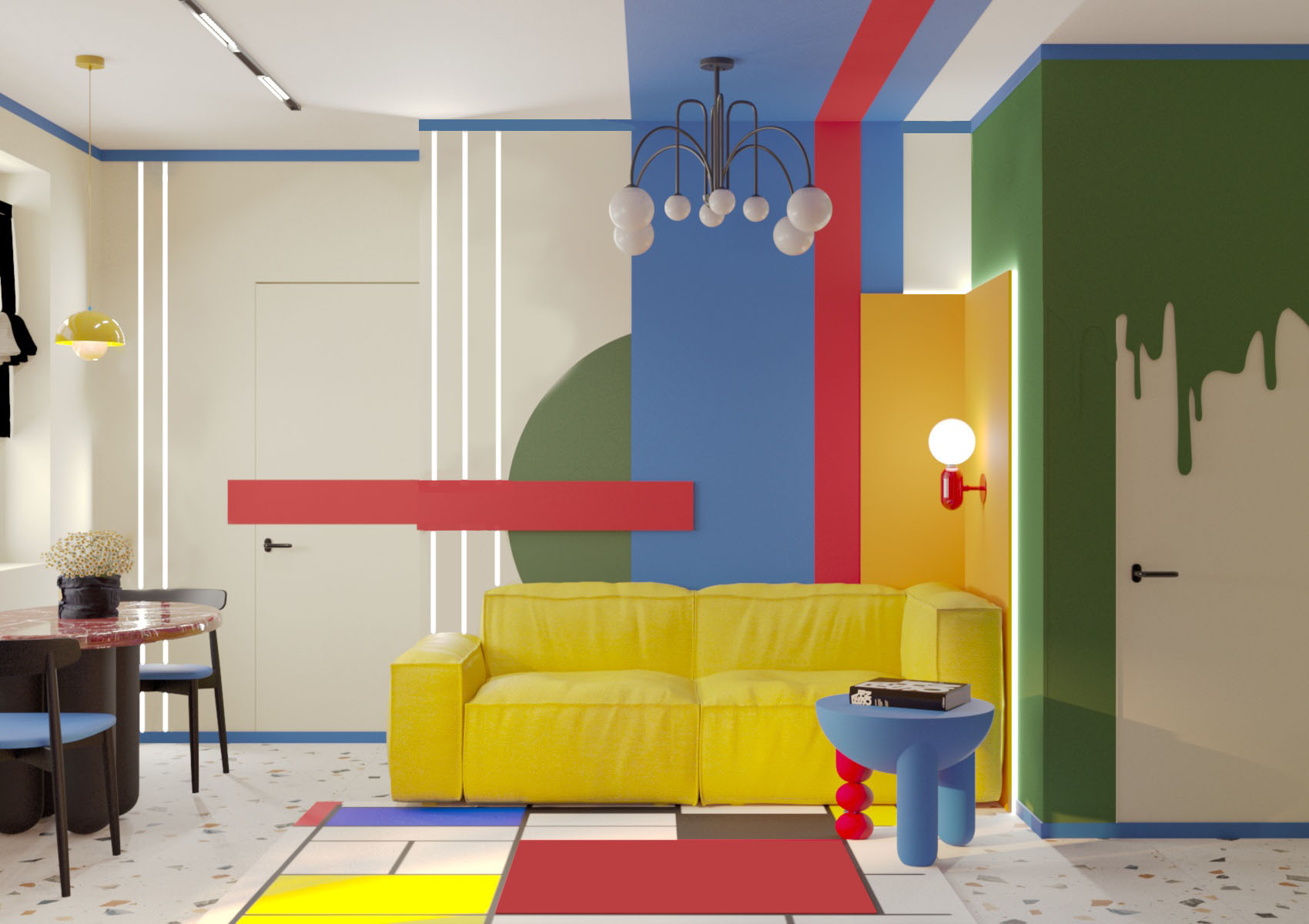 Эта квартира создана в ярких цветах с элементами авангарда, отражает влияние работ художников-авангардистов, таких как Василий Кандинский и Казимир Малевич. Основные элементы интерьера включают яркие цвета (насыщенный синий, жёлтый, красный, зелёный ) геометрические формы и линии, а также использование современных материалов и технологий. Создавая этот смелый интерьер, хотелось показать, что квартира может быть не просто обыденным жильем, но настоящим произведением искусства. Смотря на мебель, стены и все предметы находящийся в квартире, складывается ощущение, что там побывал художник и расписал все вокруг. Где-то пролилась краска, в каких-то местах он рисовал не отрывая кистью от предмета к предмету, соединяя их в единую композицию. Квартира представлялась нам свободным холстом, который очень ярко заиграл в руках художника, вдохновившегося авангардистами прошлого века.