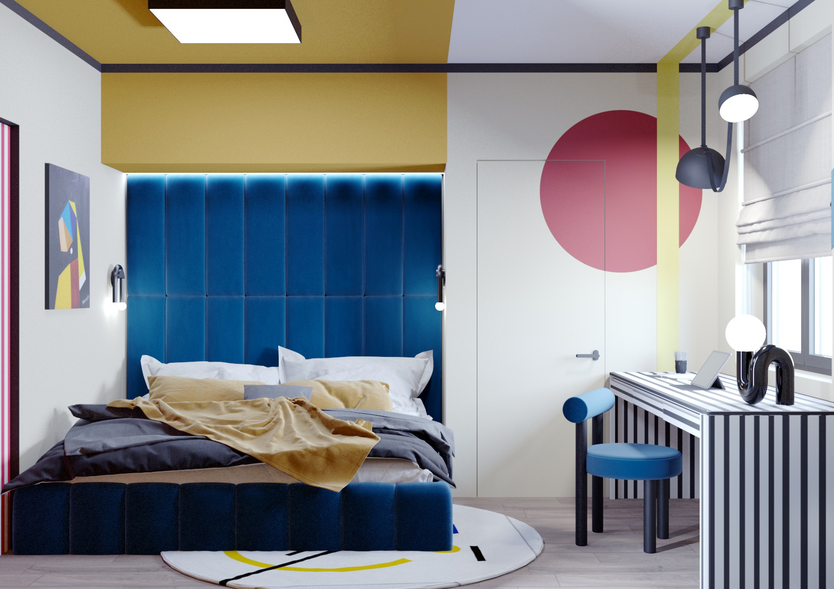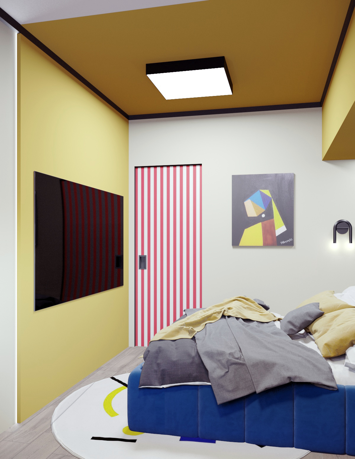 Эта квартира создана в ярких цветах с элементами авангарда, отражает влияние работ художников-авангардистов, таких как Василий Кандинский и Казимир Малевич. Основные элементы интерьера включают яркие цвета (насыщенный синий, жёлтый, красный, зелёный ) геометрические формы и линии, а также использование современных материалов и технологий. Создавая этот смелый интерьер, хотелось показать, что квартира может быть не просто обыденным жильем, но настоящим произведением искусства. Смотря на мебель, стены и все предметы находящийся в квартире, складывается ощущение, что там побывал художник и расписал все вокруг. Где-то пролилась краска, в каких-то местах он рисовал не отрывая кистью от предмета к предмету, соединяя их в единую композицию. Квартира представлялась нам свободным холстом, который очень ярко заиграл в руках художника, вдохновившегося авангардистами прошлого века.