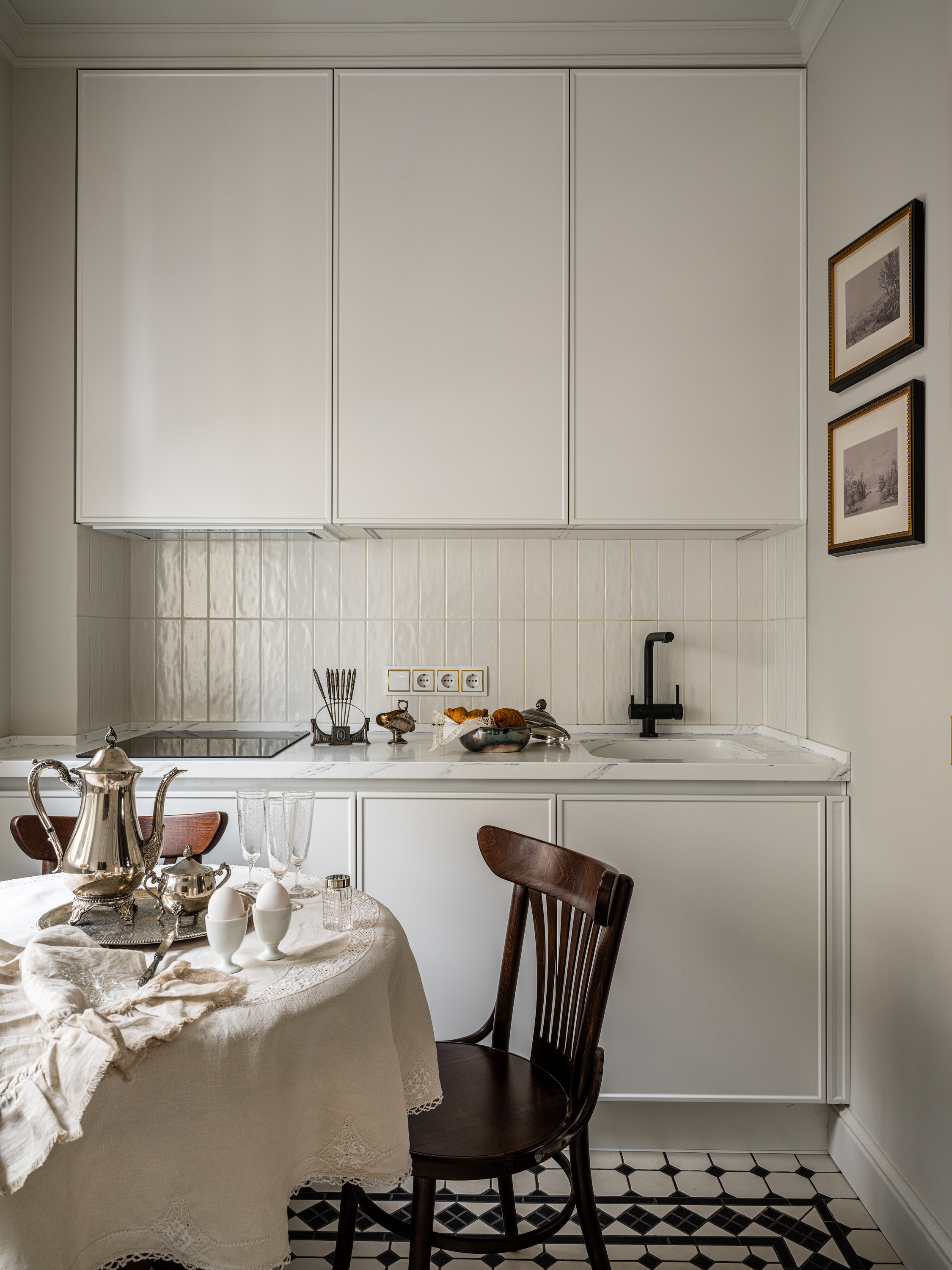 Мои заказчики хотели создать уютную квартиру для визитов в Москву. Изначально я планировала стилизацию под сталинский ампир, но хозяйка квартиры сомневалась. В результате, мы остановились на концепции «богемного интерьера» с деликатной интеграцией европейского антиквариата и некоторых элементов советского авангарда.