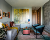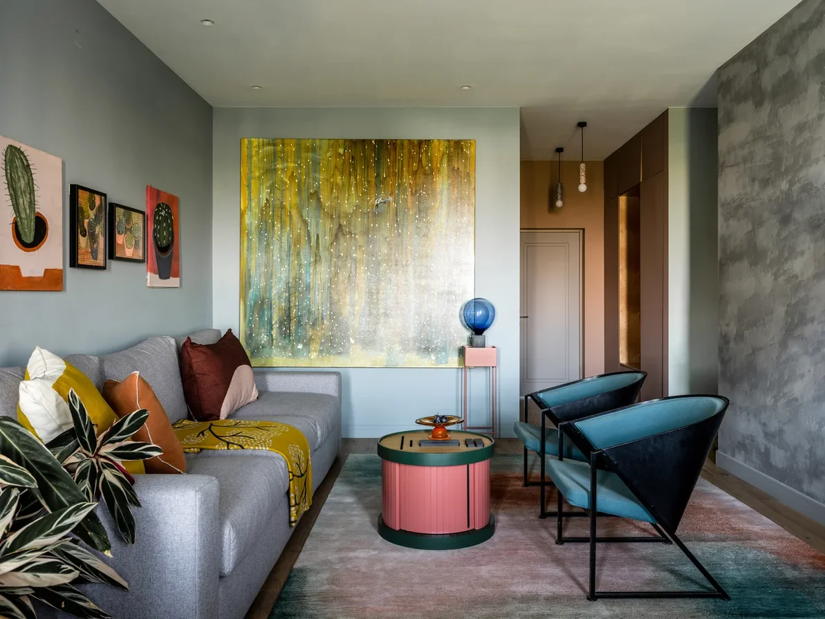 Зодиак. Покровское-Стрешнево 86 кв.м. Москва Интерьер построен вокруг ретро-палитры в серо-голубых оттенках и терракоты с ярким акцентом в ванной. Создавая ретро-настроение, выбирали мебель с характерными силуэтами того времени и предметы mid- century. Проект получился, как кадр из старого фильма, — сдержанный, стильный и романтичный.