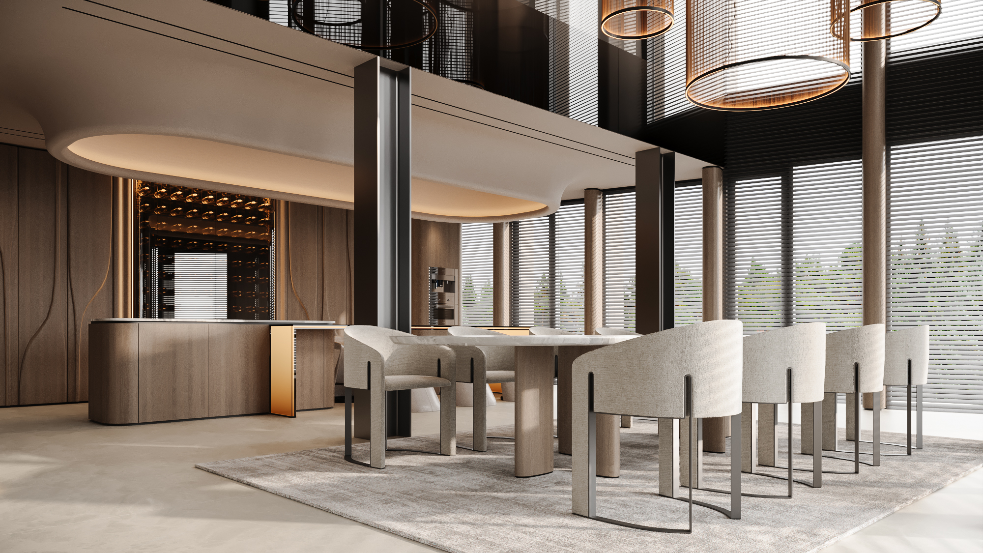Команда студии разработала интерьер двухуровневого пентхауса площадью более 1000 м², расположенного в самом сердце современного мегаполиса. Главной идеей было сформировать пространство, в котором можно отдохнуть, расслабиться и перезагрузиться после пребывания в агрессивной среде большого города с его шумом, информационными и цифровыми перегрузками. Этой концепции прекрасно соответствует один из авторский стилей студии - Nature, в основе которого лежат визуальная простота, функциональность каждой детали, натуральные цвета и материалы. Гостиная расположена на двух этажах, частично объединенных в единое пространство, имеет высоту потолков более 7 метров и двойной свет – два ряда окон, расположенных друг над другом. Кроме того, дизайнеры объединили зону отдыха, обеденную зону и кухню. Благодаря этому в гостиной много свободного места, света и воздуха. Стены отделаны шпоном натурального дерева приятного для глаз бежевого цвета. С ними отлично гармонируют удобная мягкая мебель и журнальный столик из мрамора в зоне отдыха. Центральным декоративным элементом этой зоны является огромная роскошная люстра, спускающаяся с потолка. Яркая каскадная люстра над столом также является украшением обеденной зоны. В кухне все подчинено эстетике минимализма. Техника, места для хранения, светильники и даже камин – все интегрировано и при необходимости скрывается за фасадами стен и мебели. Центром композиции является современный остров с необычными минималистичными стульями. В интерьере много живых зеленых растений, собранных в композиции по принципам ландшафтного дизайна и подсвеченных яркими напольными светильниками-шарами. Вечером они делают атмосферу в комнате волшебной. На второй этаж можно подняться по дизайнерской лестнице с подсветкой ступеней и перилами из тонированного стекла. Наверху нас встречает видовая галерея с декоративными колоннами и дополнительная зона отдыха для тех, кому хочется уюта и уединения. Здесь же расположены спальни для владельцев пенхауса и их гостей. Пентхаус– настоящий оазис тишины, спокойствия и релаксации посреди мегаполиса.