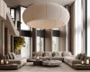 Гостиная расположена на двух этажах, частично объединенных в единое пространство, имеет высоту потолков более 7 метров и двойной свет – два ряда окон, расположенных друг над другом. Кроме того, дизайнеры объединили зону отдыха, обеденную зону и кухню. Благодаря этому в гостиной много свободного места, света и воздуха. Стены отделаны шпоном натурального дерева приятного для глаз бежевого цвета. С ними отлично гармонируют удобная мягкая мебель и журнальный столик из мрамора в зоне отдыха. Центральным декоративным элементом этой зоны является огромная роскошная люстра, спускающаяся с потолка.