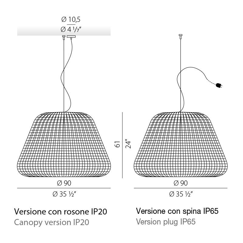 Уличные светильники в подвесной, настольной и напольной версиях, а также со штыком для установки на землю. Абажур из сотканного в ручную искусственного ротанга, основание из алюминия/латуни (настольная, напольная и версия со штыком). Внутри абажура сфера из поликарбоната с лампой. Светильник со штыковым креплением, предназначен для легкого снятия на зиму. Подвесная версия поставляется с оранжевым кабелем питания (версия диаметром 90 см также оснащена стальным тросом). Доступны аксессуары для крепления к стене. Идеально подходит для открытых площадок, террас или освещения сада.