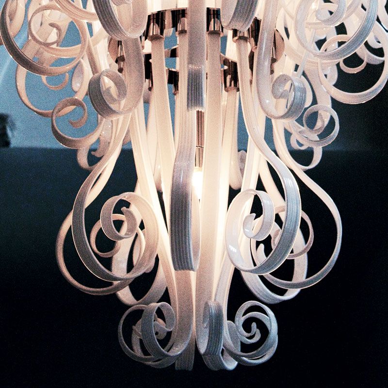 Ciocca - это коллекция с элегантным и уникальным дизайном. Она состоит из металлической конструкции, которая удерживает многочисленные стеклянные “ленты” ручной работы. Опытные стеклодувы вытягивают и текстурируют эти ленты, создавая в целом извилистый и органичный дизайн. Существует множество конфигураций этого изделия, начиная от подвесного светильника и заканчивая настенным светильником.
