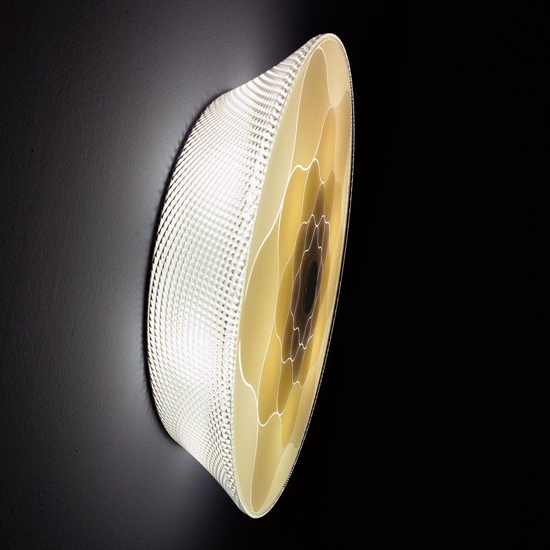 Когда светильник выключен, поверхность стеклянного рассеивателя с сериграфией выглядит как ровная белая поверхность, и на ней видны только очертания цветочного декора. Во включенном состоянии поверхность оживает различными цветовыми оттенками, что обусловлено количеством слоев сериграфии. Вдоль контура декора свет более четкий, потому что цвета меньше и напротив, к центру, где цвета больше, интенсивность света уменьшается.