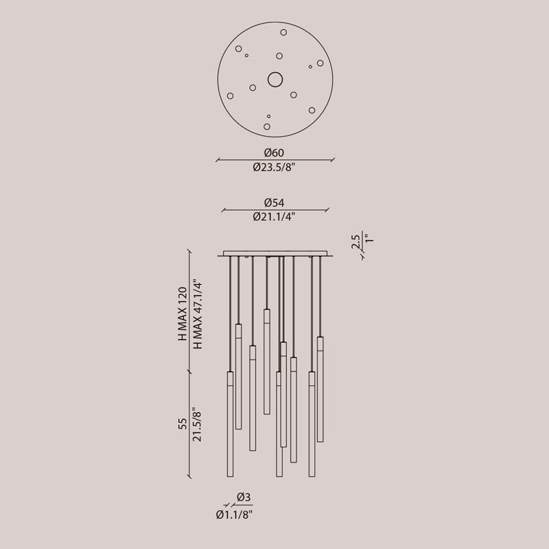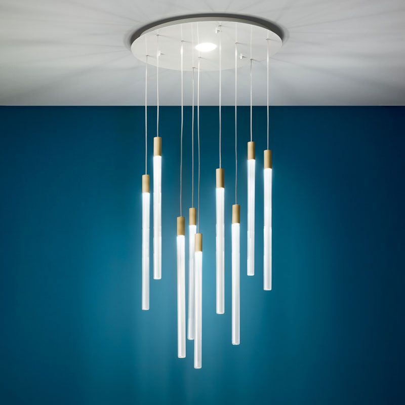 Подвесной светильник, состоящий из трубки из боросиликатного стекла с пескоструйной обработкой и трубкой из ПММА внутри. Конструкция из алюминия. Анодированная отделка золотого или платиного цвета. Двойное излучение света. Потолочное крепление белого цвета.