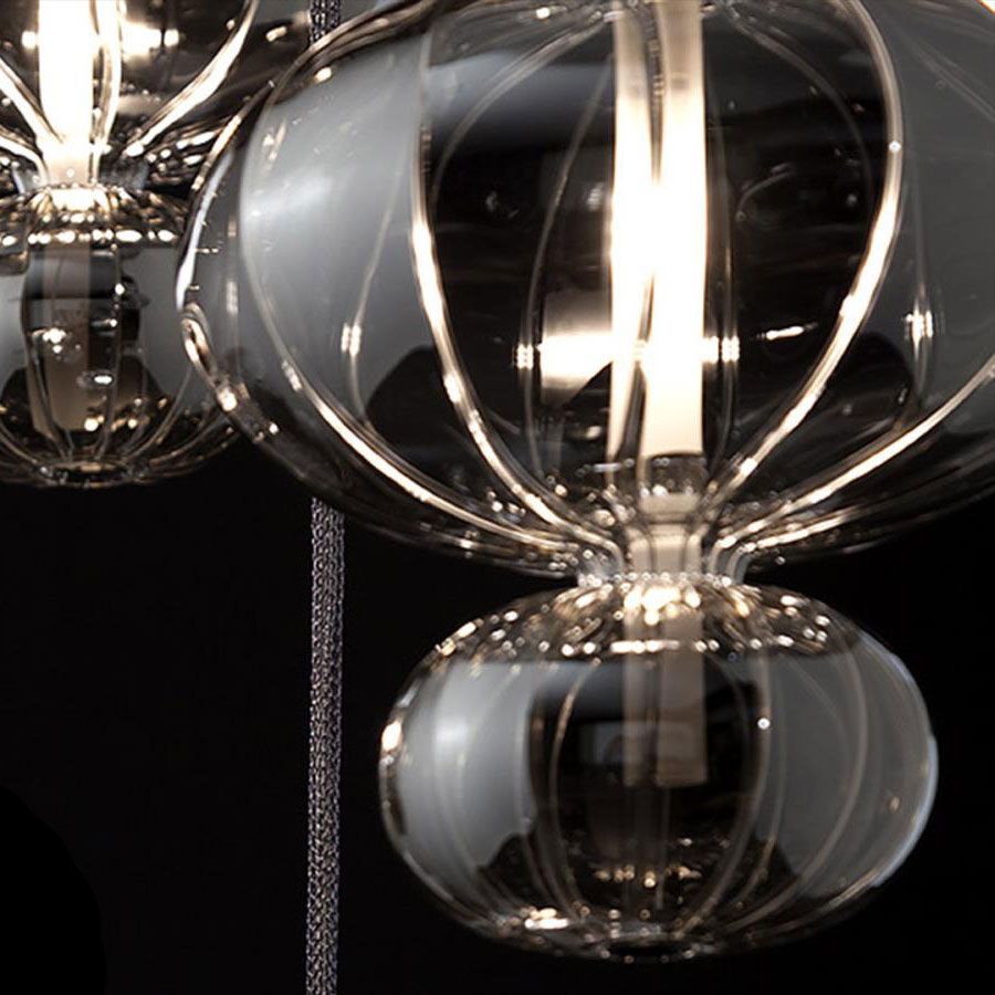 Формы из выдувного стекла, прозрачные или матовые, подвешенные к металлическим сетчатым трубчатым сеткам, отражают свет в комнате, создавая наводящие на размышления сцены.