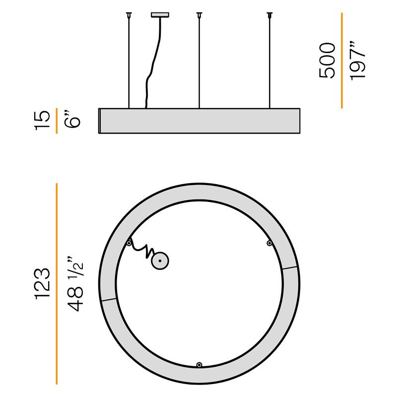 Подвесное кольцо из изогнутого алюминия с верхним и нижним экранами с высоким коэффициентом пропускания из опалового поликарбоната. Излучение как прямого, так и непрямого или только прямого света через светодиодные модули. Все версии с двойным излучением оснащены диммером DALI / Push DIM. Подвешивается на 3 стальных тросах (6 в версии D 300 см). Версия D 300 см поставляется в виде двух полукругов. Идеально подходят для жилых помещений, великолепных композиций для офисов, гостиниц и общественных мест.