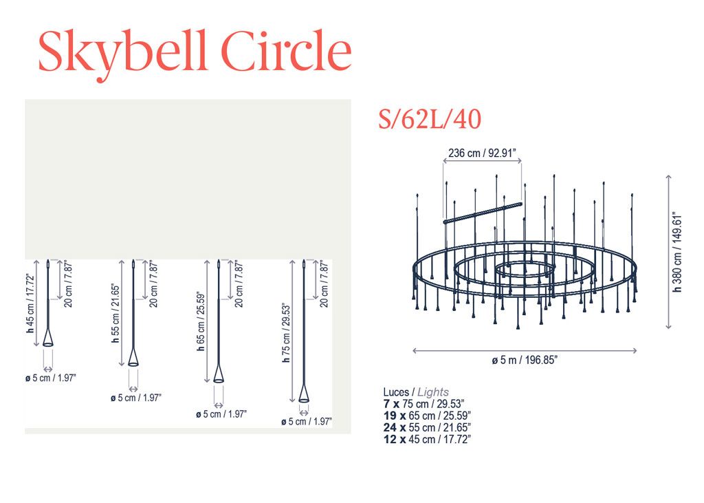 Skybell — это обширная система световых конструкций, разработанная для адаптации к любому типу применения. Их главная характеристика — это создаваемый ими образ: они ненавязчивы и жизнерадостны. Они дарят ощущение фантазии и свободы в своих применениях, поскольку их можно комбинировать в различных вариантах, смешивая 4 размера, чтобы создать более индивидуальную и динамичную концепцию светильника, или же сохранять все «колокола» одинаковой длины, создавая более традиционный образ. В зависимости от предпочтений пользователя, положение «колоколов» можно легко изменить с помощью разъема (джека), который позволяет подключать их к сети одним щелчком. Эта функция подходит для всей коллекции Skybell.