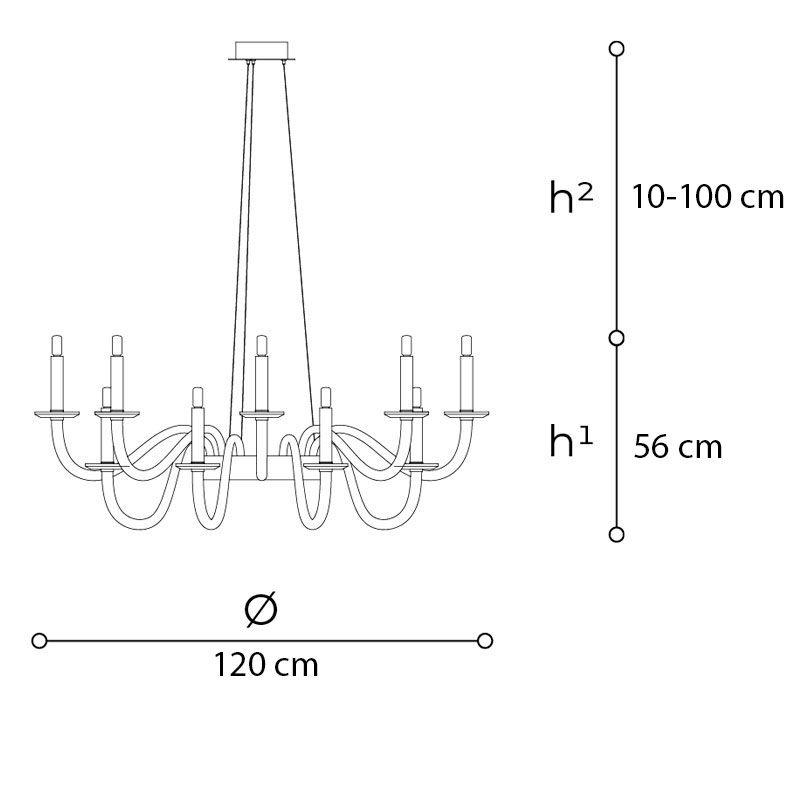 От кольцевого основания расходятся изящно изогнутые стеклянные трубки, завершающиеся световыми элементами, напоминающими свечи. Дисковидные детали выполняют роль современных подсвечников, усиливая ассоциацию с классическим канделябром.