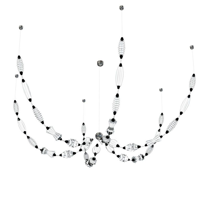 Система строится на игре форм, света и цвета: стеклянные элементы искажают и преломляют свет, создавая живую, постоянно меняющуюся визуальную динамику. Каждая композиция выглядит уникально, словно индивидуально собранное украшение.
