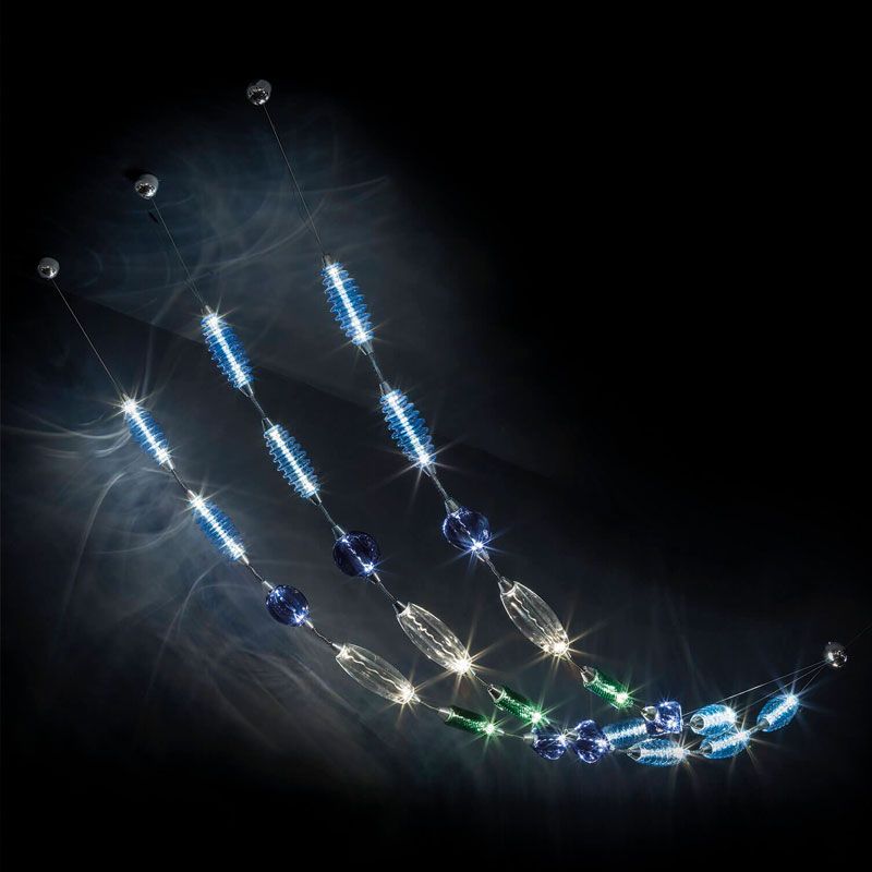 Система строится на игре форм, света и цвета: стеклянные элементы искажают и преломляют свет, создавая живую, постоянно меняющуюся визуальную динамику. Каждая композиция выглядит уникально, словно индивидуально собранное украшение.