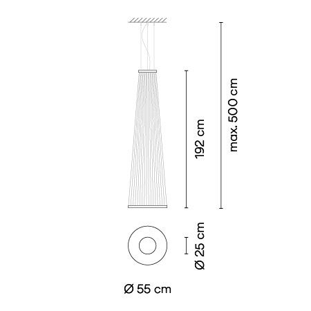 Состоящий из множества тонких технических нитей, туго натянутых между двумя алюминиевыми кольцами, Array представляет широкий спектр конических и цилиндрических силуэтов, которые можно комбинировать вместе, образуя привлекательную инсталляцию. Равномерное распределение нитей создает прозрачность и объем, в то время как эффект наслоения создает иллюзию движения. Подвешенный над головой массив излучает приятный нисходящий свет, исходящий от невидимого источника, скрытого внутри нижнего кольца. В то же время непрямой свет устремляется вверх в виде градиента цвета, скорее обволакивая, чем вторгаясь в пространство, которое он занимает.