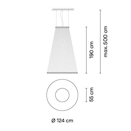 Состоящий из множества тонких технических нитей, туго натянутых между двумя алюминиевыми кольцами, Array представляет широкий спектр конических и цилиндрических силуэтов, которые можно комбинировать вместе, образуя привлекательную инсталляцию. Равномерное распределение нитей создает прозрачность и объем, в то время как эффект наслоения создает иллюзию движения. Подвешенный над головой массив излучает приятный нисходящий свет, исходящий от невидимого источника, скрытого внутри нижнего кольца. В то же время непрямой свет устремляется вверх в виде градиента цвета, скорее обволакивая, чем вторгаясь в пространство, которое он занимает.