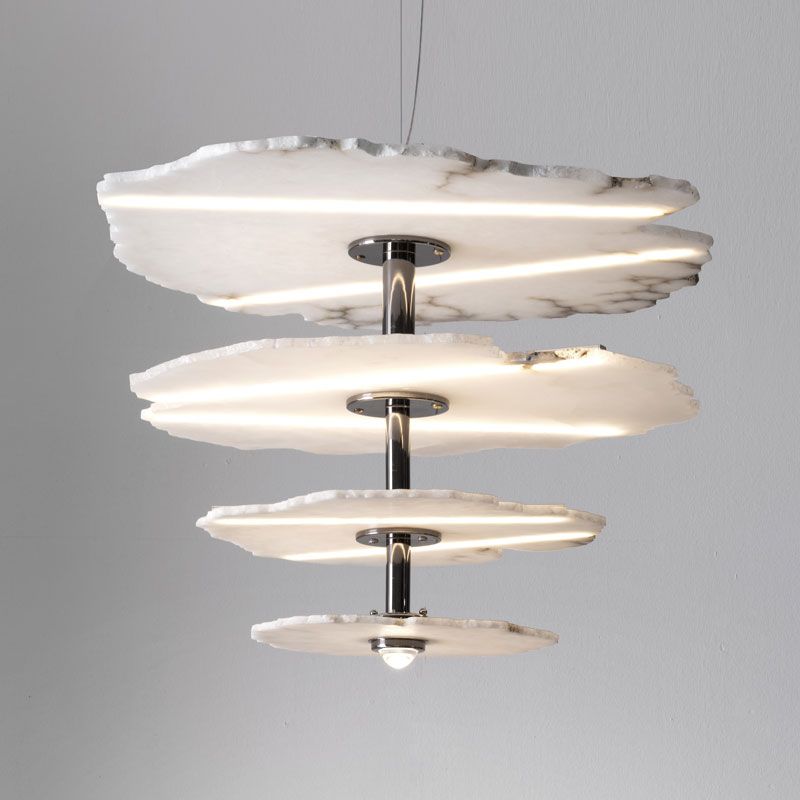 Центральная латунная конструкция поддерживает плиты и дополняет дизайн. Различные светодиодные ленты рисуют яркие линии на алебастре и излучают рассеянный свет от плит из чистого камня. Стеклянная оптика под нижней плитой обеспечивает прямое освещение под люстрой.