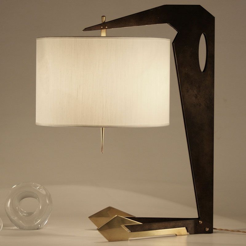 Лампа с металлической конструкцией из натурального вощеного железа и слегка отполированной латуни. Круглый абажур из шантунга цвета слоновой кости; детали из латуни.