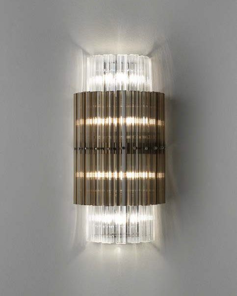 Конструкция выполнена из металла с хромированной отделкой и дополнена четырёхугольными элементами из муранского стекла прозрачного, дымчатого или тикового цвета, которые эффектно фильтруют свет, исходящий от источника, расположенного по периметру.