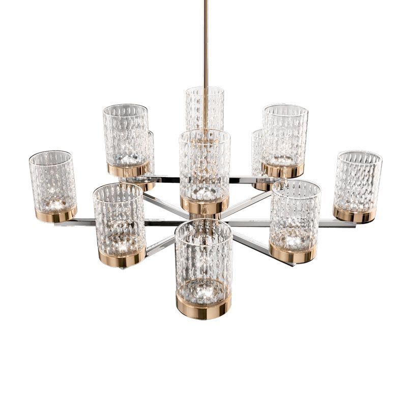 Композиция строится на чётких металлических линиях, к которым крепятся цилиндрические плафоны из резного стекла. Их поверхность украшена ритмичным фактурным узором, благодаря которому свет мягко преломляется и создаёт многослойное сияние.