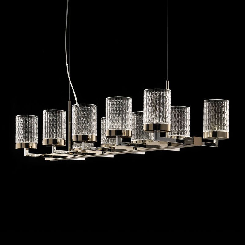 Композиция строится на чётких металлических линиях, к которым крепятся цилиндрические плафоны из резного стекла. Их поверхность украшена ритмичным фактурным узором, благодаря которому свет мягко преломляется и создаёт многослойное сияние.