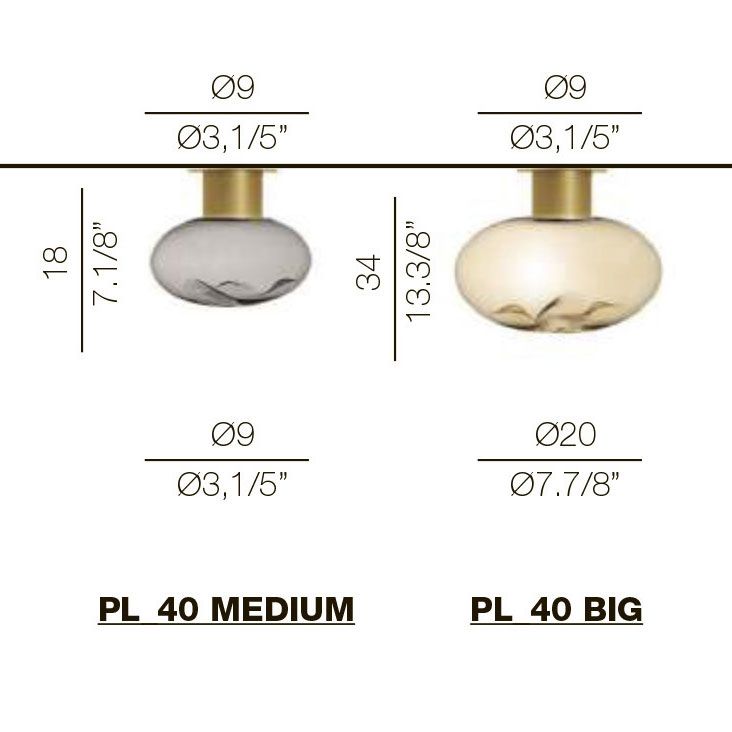 Диффузор из дутого боросиликатного стекла. Стекло на 100% изготовлено вручную в Италии, что гарантирует высокое качество и уникальность каждого стекла. Стеклянный диффузор доступен в прозрачном, янтарном и дымчатом исполнении в 2 размерах: D20 см и D17 см. Маленький декоративный элемент D14 см доступен в металлизированном золоте или хроме. Металлическая конструкция из алюминия доступна в 4 отделках.