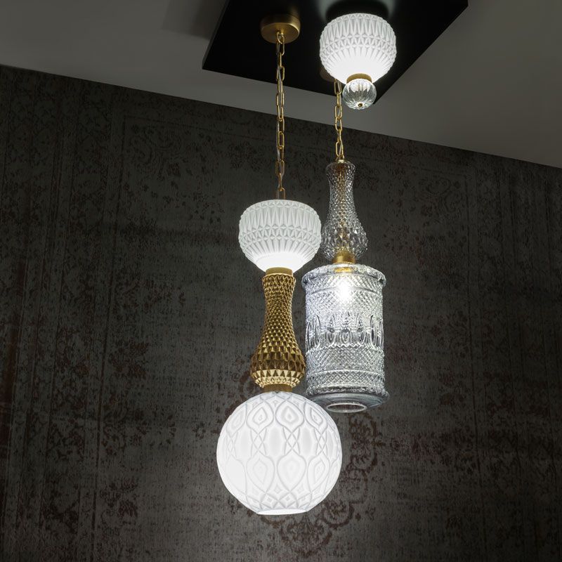 Коллекция OMG, аббревиатура от Oh My Glass! - это дань красоте формованного стекла. Разнообразие форм, размеров и отделки для создания «симфонии» подвесов и потолочных светильников. Вариации цвета стекла, отделки рамы и форм делают возможными различные комбинации. Стекло доступно прозрачное или белое. Структура и потолочное крепление: матовый никель или золото.