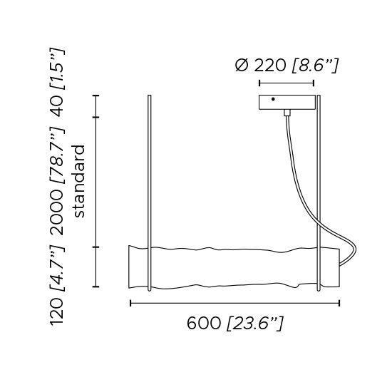 Рссеиватели выполнены из двойного сатинового поликарбоната разной высоты, которые имеют неправильный вид смятых бумажных трубочек, а потолочная розетка выполнена в матово-белом лаковом покрытии. Отличительный мягкий текстильный шнур белого/серого цвета - деталь, выражающая архидекоративный стилистический код бренда, становится соединительным элементом для настольного и напольного вариантов и поддерживает лампу в подвесном варианте.
