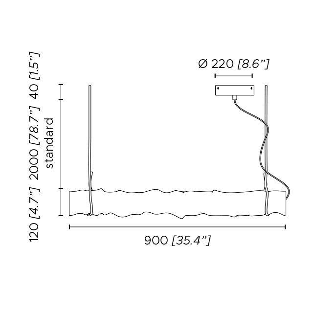 Рссеиватели выполнены из двойного сатинового поликарбоната разной высоты, которые имеют неправильный вид смятых бумажных трубочек, а потолочная розетка выполнена в матово-белом лаковом покрытии. Отличительный мягкий текстильный шнур белого/серого цвета - деталь, выражающая архидекоративный стилистический код бренда, становится соединительным элементом для настольного и напольного вариантов и поддерживает лампу в подвесном варианте.