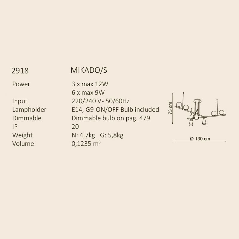 В коллекции Mikado сферы и конусы сочетаются в металлической раме, окрашенной в черный цвет, с деталями из матовой латуни. Элегантный дизайн, дополненный матовым стеклом различной формы, делает уникальным не только само изделие, но и помещение, в котором оно установлено.
