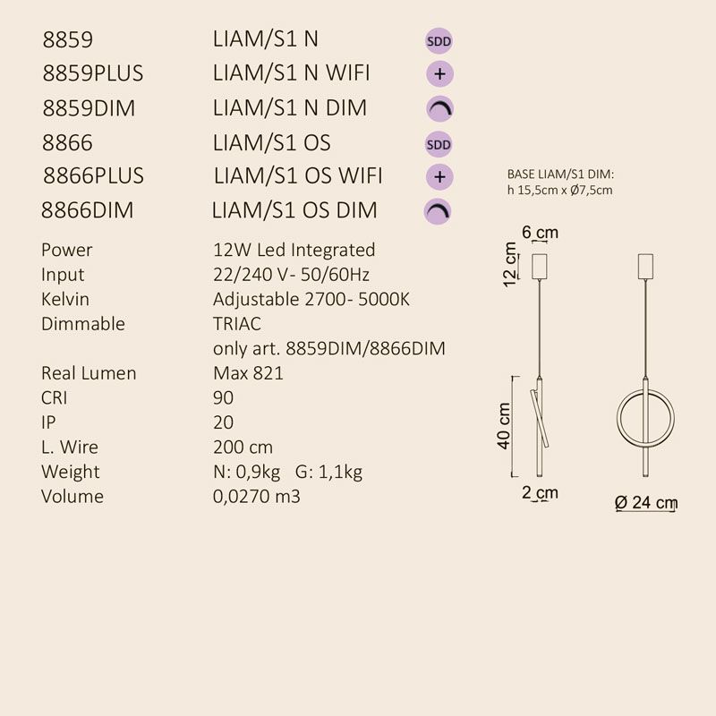 Подвесной светильник Liam доступен как в виде отдельного модуля, так и без основания, что позволяет интегрировать его с модульными основаниями для создания индивидуальных конфигураций. Освещение обеспечивается встроенной светодиодной лентой, проходящей вдоль кольца, что обеспечивает равномерное и эффективное распределение света. Каркас выполнен из матовой латуни или матово-черного цвета, что обеспечивает долговечность и изысканный внешний вид. Черный тканевый кабель повышает качество конструкции.