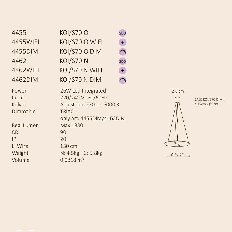 Коллекция Koi доступна в подвесном, настенном и потолочном вариантах, различных размерах для различных конфигураций установки. Доступные цвета: матовый чёрный и матовый золотой, оба цвета получены с помощью высокостойкой краски. Светодиодная лента CCT обеспечивает оптимальное светораспределение, позволяя регулировать цветовую температуру для создания индивидуального освещения. Прозрачный акриловый рассеиватель улучшает распределение света, уменьшая блики и повышая оптическую эффективность.
