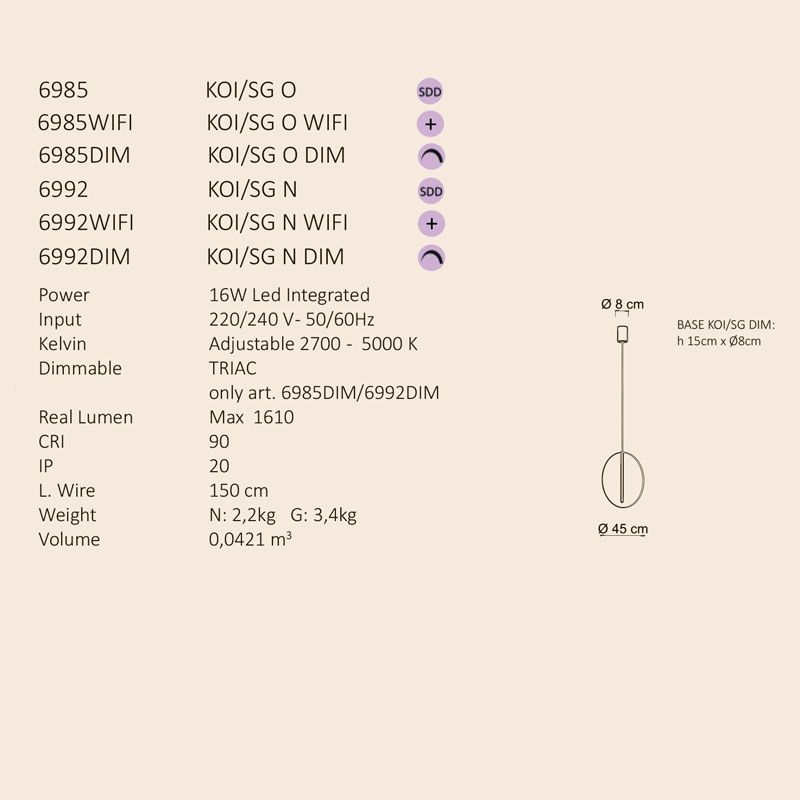 Коллекция Koi доступна в подвесном, настенном и потолочном вариантах, различных размерах для различных конфигураций установки. Доступные цвета: матовый чёрный и матовый золотой, оба цвета получены с помощью высокостойкой краски. Светодиодная лента CCT обеспечивает оптимальное светораспределение, позволяя регулировать цветовую температуру для создания индивидуального освещения. Прозрачный акриловый рассеиватель улучшает распределение света, уменьшая блики и повышая оптическую эффективность.