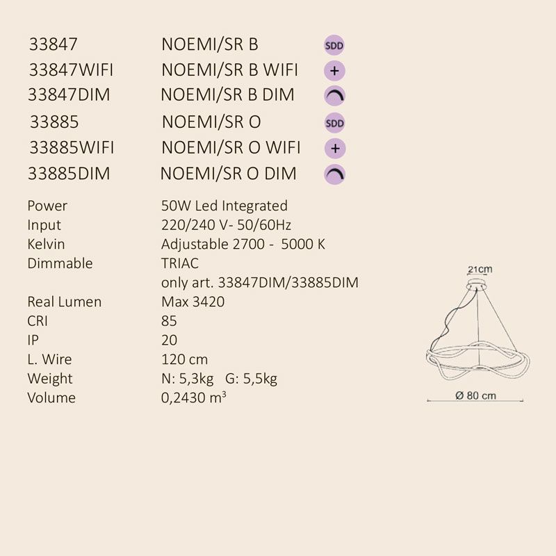 Светильник Noemi отличается инновационным и современным дизайном, характеризующимся извилистыми формами, которые придают ему лёгкость и элегантность. Рассеиватель в виде трубки изготовлен из ПММА со встроенной светодиодной лентой, что обеспечивает равномерное и эффективное освещение.