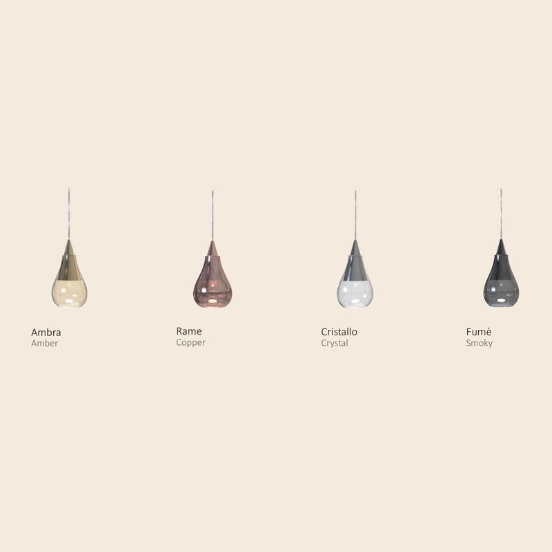 Коллекция Sospesi отличается искусной обработкой стекла. Органическая форма привлекает своим дизайном и стилем, благодаря отсылке к природе и ее нежному дождю. Цвета стекла доступны в медном, хромированном, золотом и хрустальном вариантах. Подвески можно использовать по отдельности или в композиции.