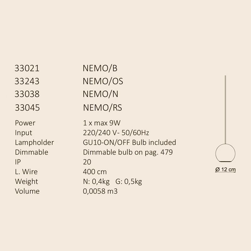 Коллекция Nemo отличается универсальностью и изысканным дизайном. Она доступна как в подвесной версии на тросе, так и в базовой версии, которую можно установить на потолок или стену. Ключевая особенность — регулируемость, позволяющая точно направлять свет в соответствии с конкретными потребностями. Освещение обеспечивается легко заменяемой лампой GU10.