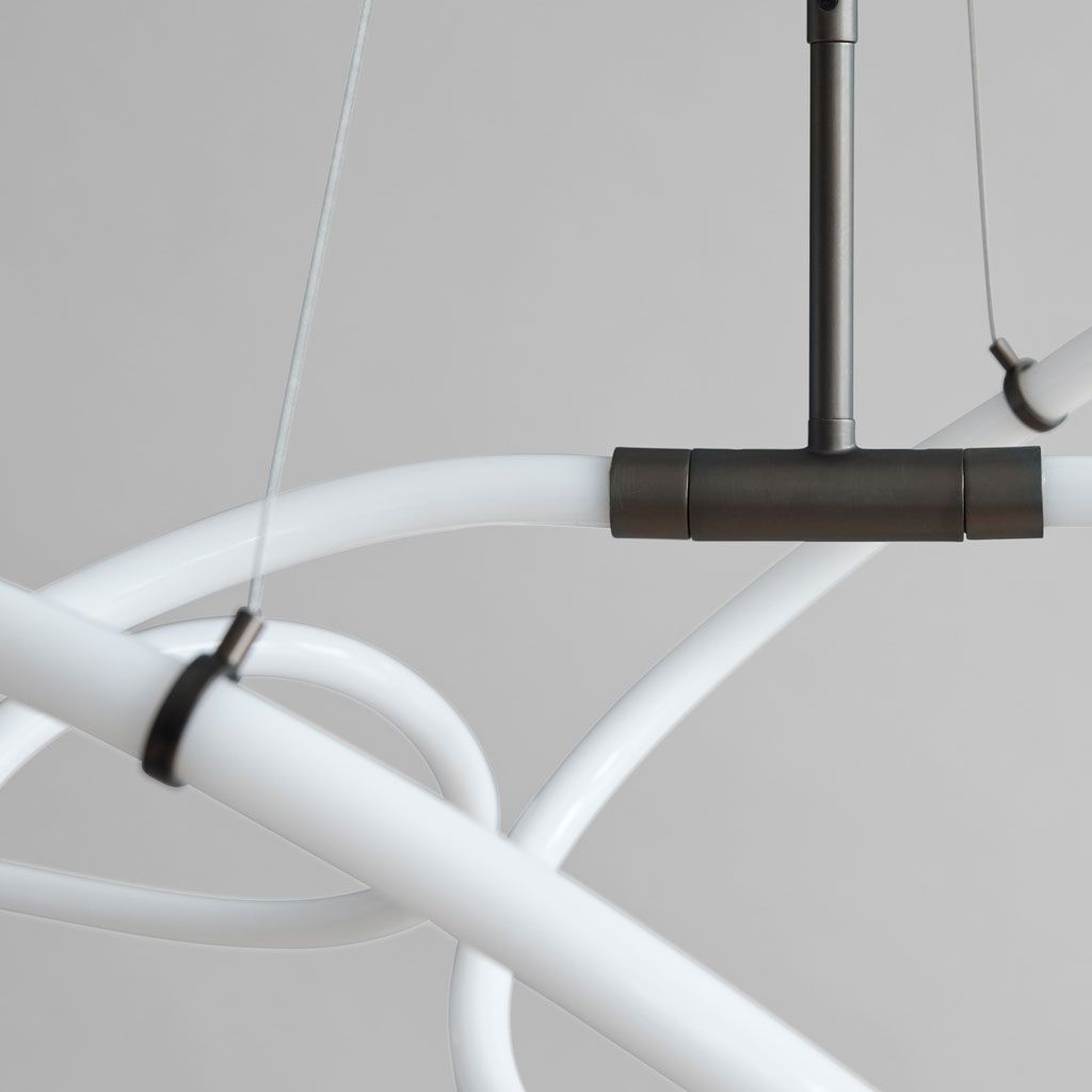 Светильник Ghost доступен в двух размерах и оснащен встроенным светодиодом. В этой серии выделяется светящаяся белая акриловая трубка, в которой заключен долговечный светодиодный источник света, способный проработать 25 000 часов при теплом Кельвине 2400. Отказавшись от мрачности, обычно ассоциирующейся с неоном, эти инновационные лампы излучают более теплое и привлекательное свечение, создавая атмосферу уюта и комфорта. Бронзовые металлические акценты придают изысканность минималистичному дизайну. Созданная вручную конструкция светильника Ghost обеспечивает уникальное каскадное распределение света вдоль ее изогнутых трубок, в результате чего в определенной части трубки светят ярче. Подвешенный на четырех регулируемых тросах из нержавеющей стали, светильник может быть установлен на идеальной высоте для любой комнаты.